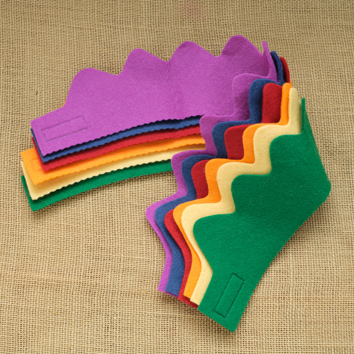 A set of six Colorful Wool Felt Crowns are perfect for dress up play and and costumes. Treat your party guests like a prince or princess with a colorful crown party favor. They have adjustable Velcro closure to fit most little heads. American made right here in Ann Arbor, Michigan, with wool felt.