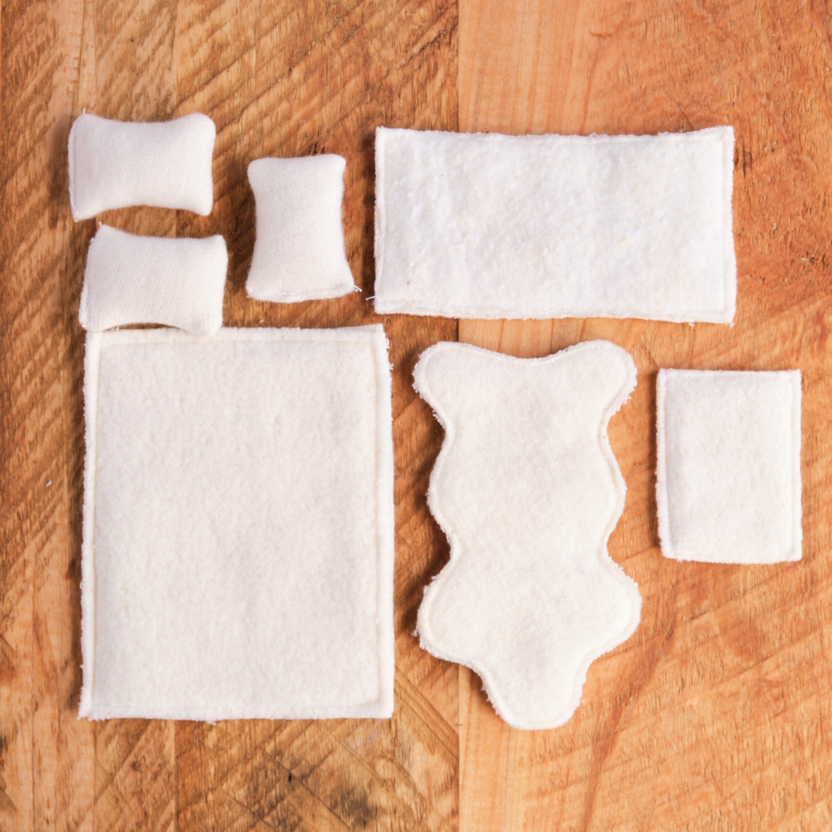 Our Dollhouse Accessory Set is made in Michigan and comes with 7 pieces. Many possibilities with these items to be used as blankets, rugs, table runners and pillow accessories. (Furniture and dolls not included.)