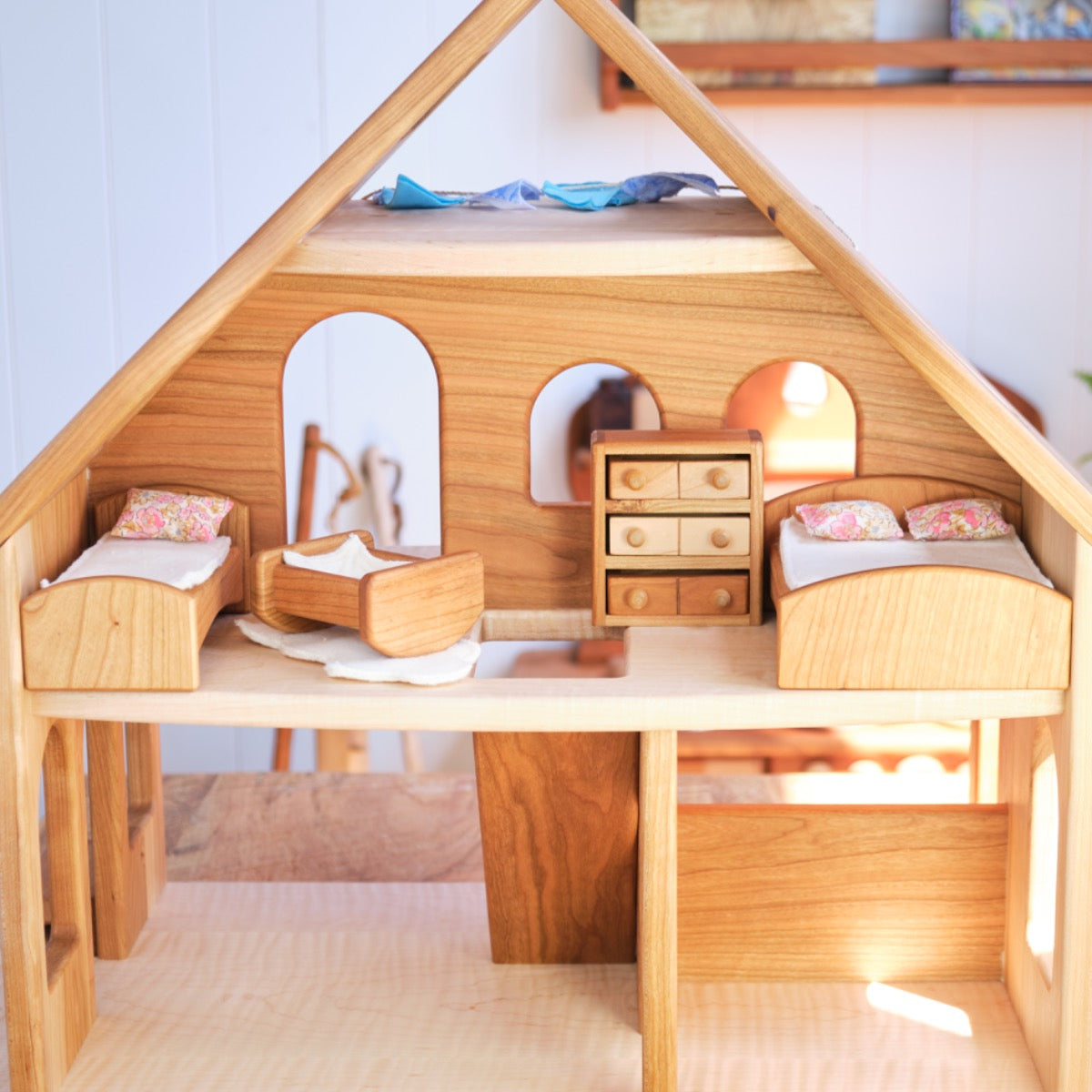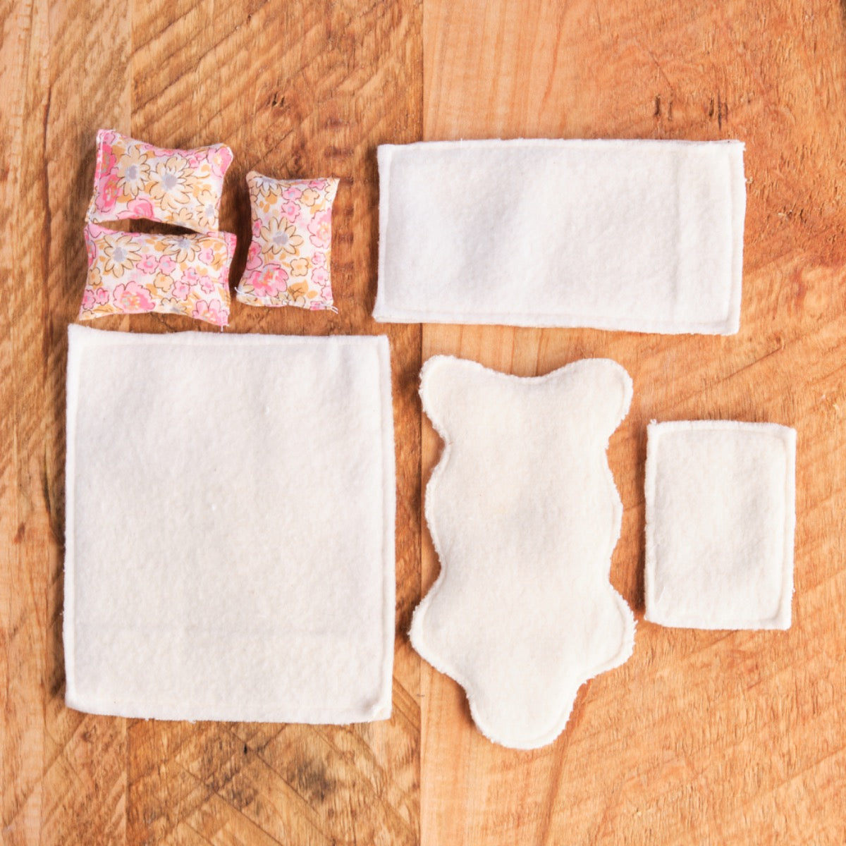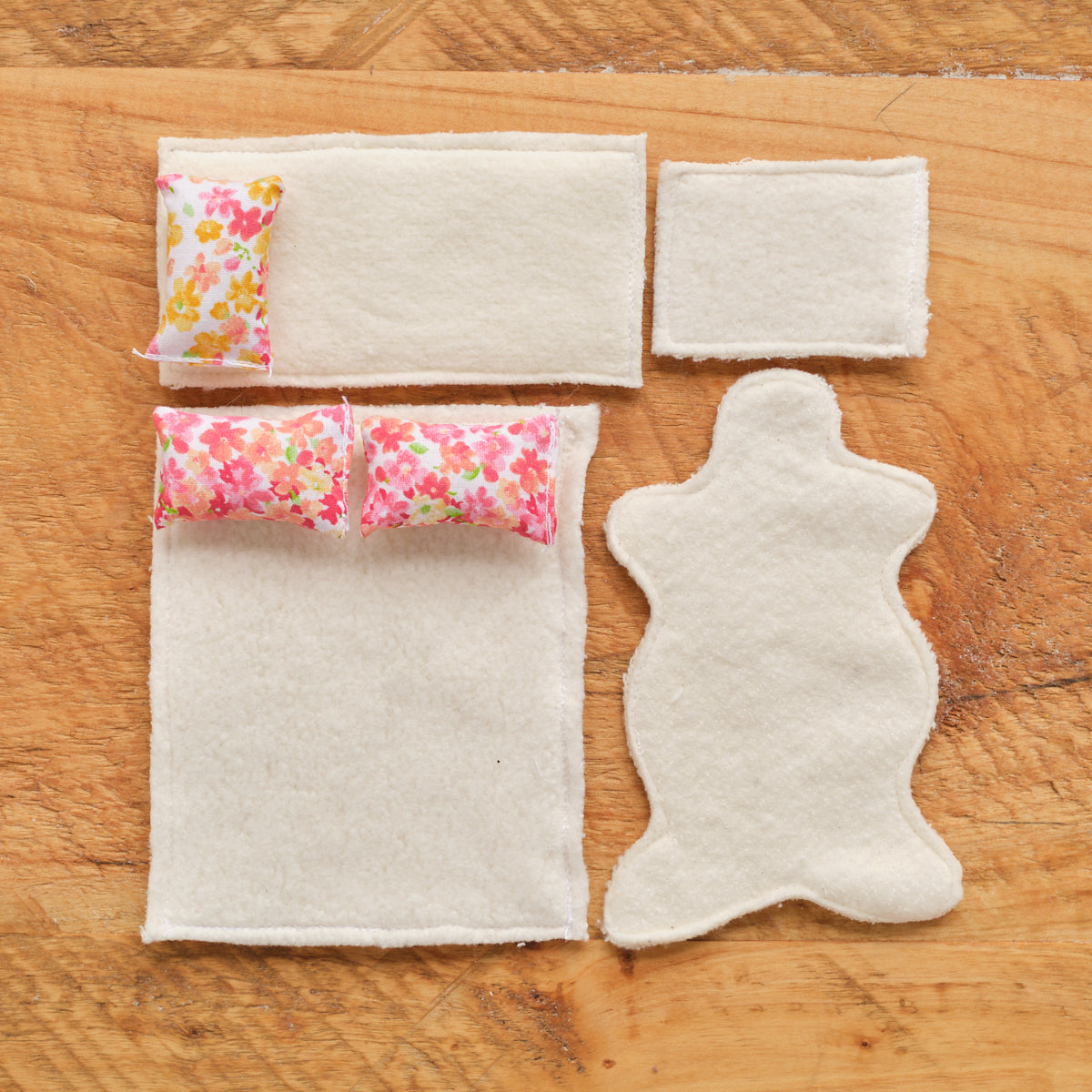 Make your dollhouse a sweet home with hand made furnishings for your dollhouse. All items are designed to coordinate with and fit our cherry dollhouse and furniture. Organic cotton Sherpa blankets and rugs add a nice neutral contrast to the floral print pillows that are sewn with turned over edges and stuffed! (Furniture and dolls sold separately.)