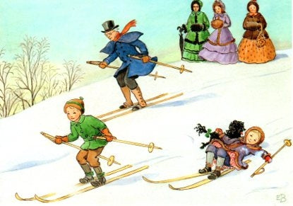 Elsa Beskow Postcard, Peter and Lotta Skiing - 4-1/8" x 5-13/16"