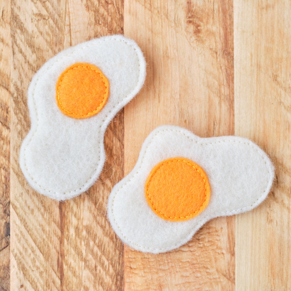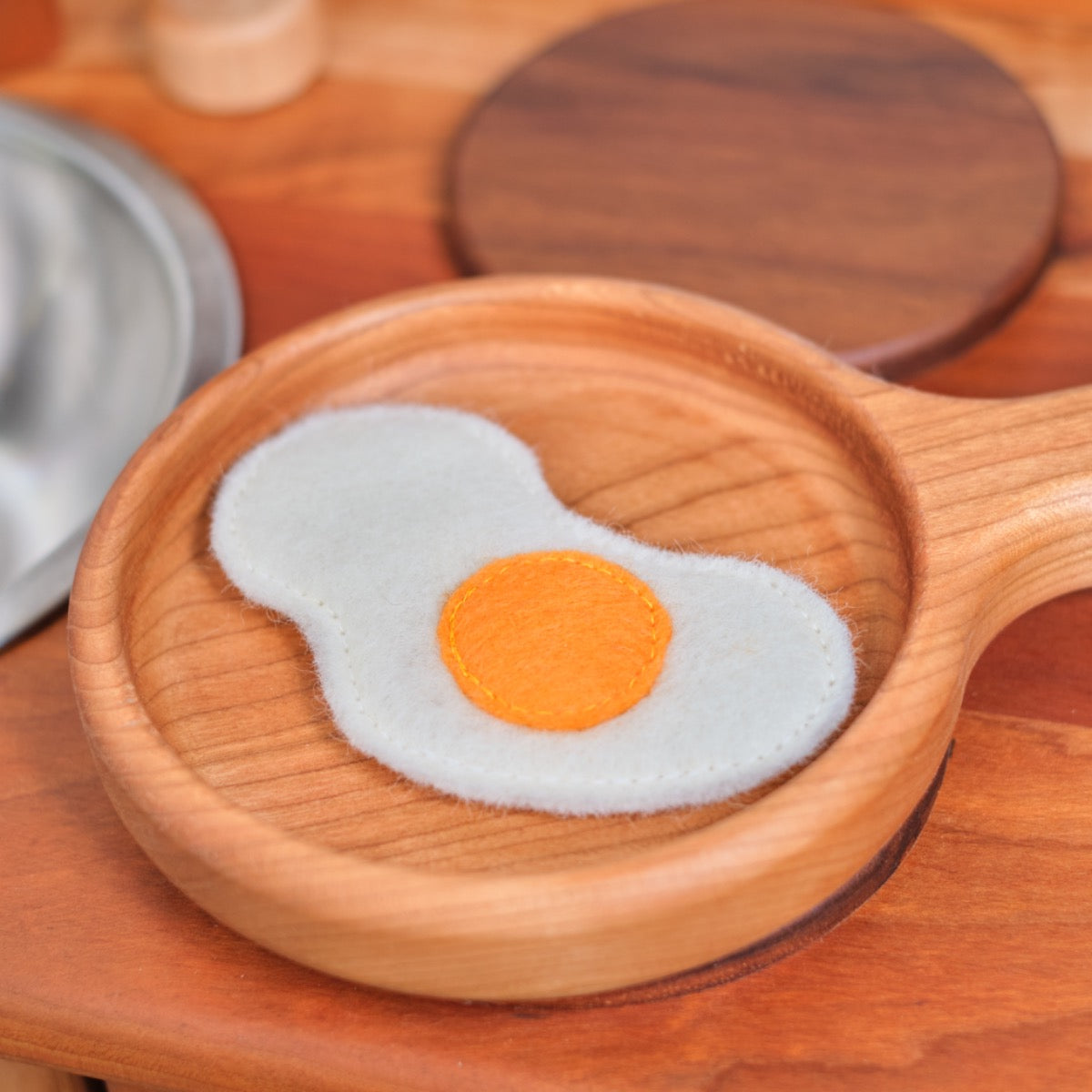 This cute little set of 2 felt fried eggs is made of 100% wool felt and is handmade in Michigan. A great addition to our play kitchens, and even more adorable paired with one of our wooden frying pans. Wooden frying pan and cooking utensils not included.
