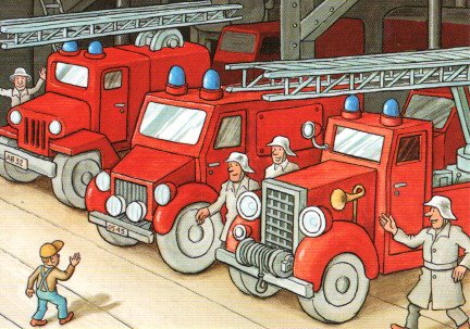Vibrant fire truck postcard to please little eyes. Illustration by Jan Loof. This postcard will make a great addition to your nature table, inspire the walls of your home/classroom, use as postcard or as a tag for a gift.