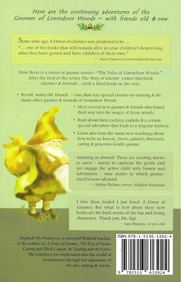 Revisit many old friends - Gus, that very special Gnome-in-training & the many other gnomes & animals of Limindoor Woods. Meet several new gnomes & friends who found their way into the magic of those woods. Read about their exciting exploits & a certain special adventure that leads to a singular mystery. Learn also, from the many new teachings about how to be an honest, brave, patient, observant, caring & generous Gentle-gnome.