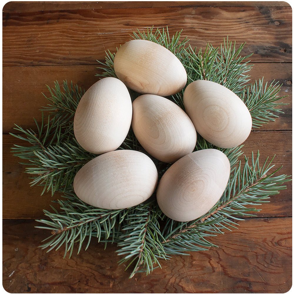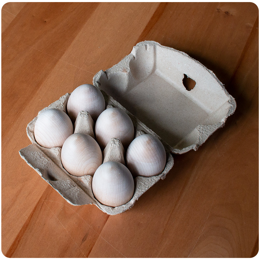 Straight from "Camden Rose Farms" we offer a set of 6 wooden hen-sized eggs in a recyclable egg container. Unfinished natural wood may be polished to add luster and to protect the wood.