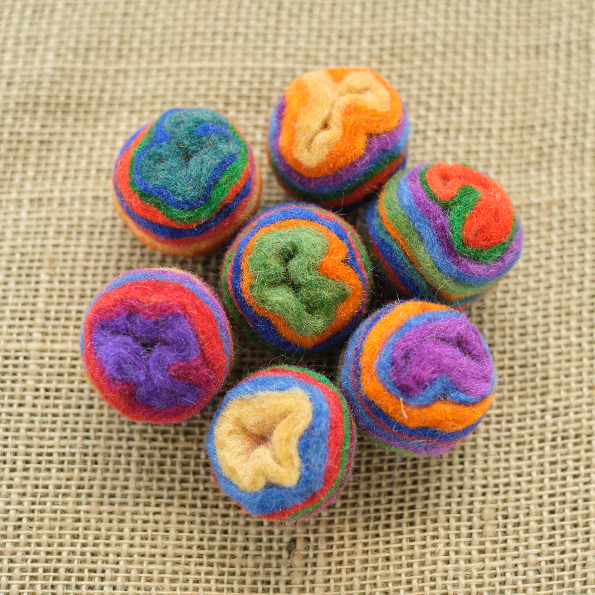 These balls are 100% wool felt that are made from pieces of felt that are stacked together, sewn in the middle and the felted and trimmed to make a magical swirl ball! Sold individually, and colors may vary.