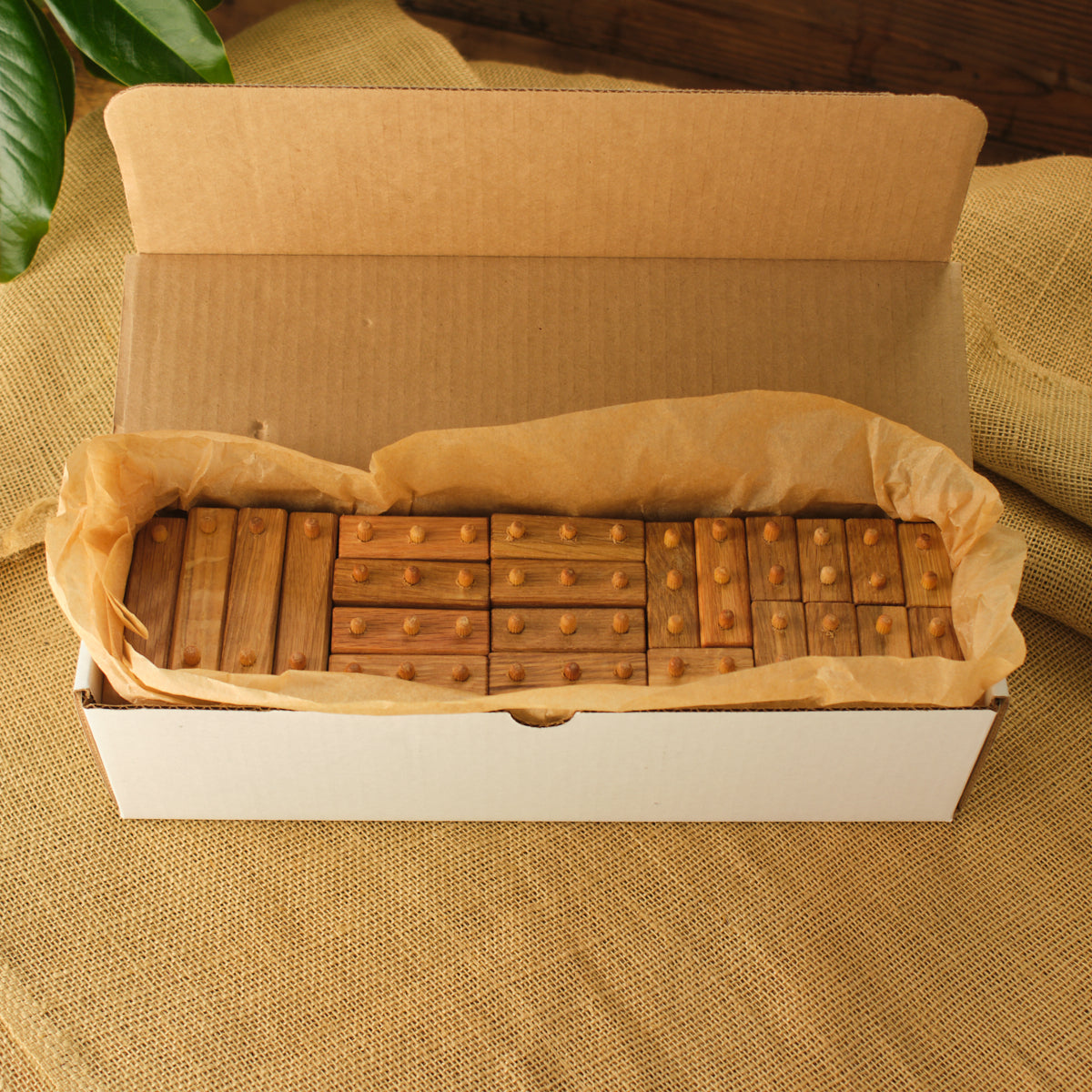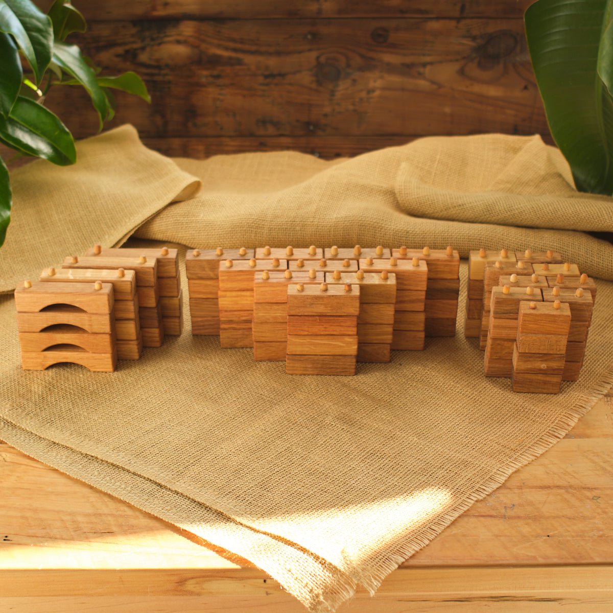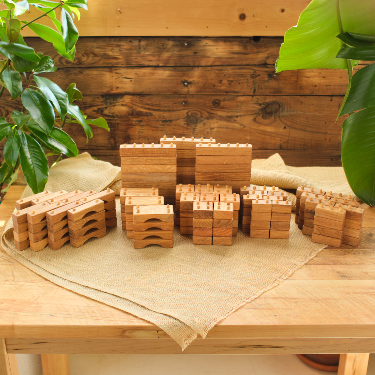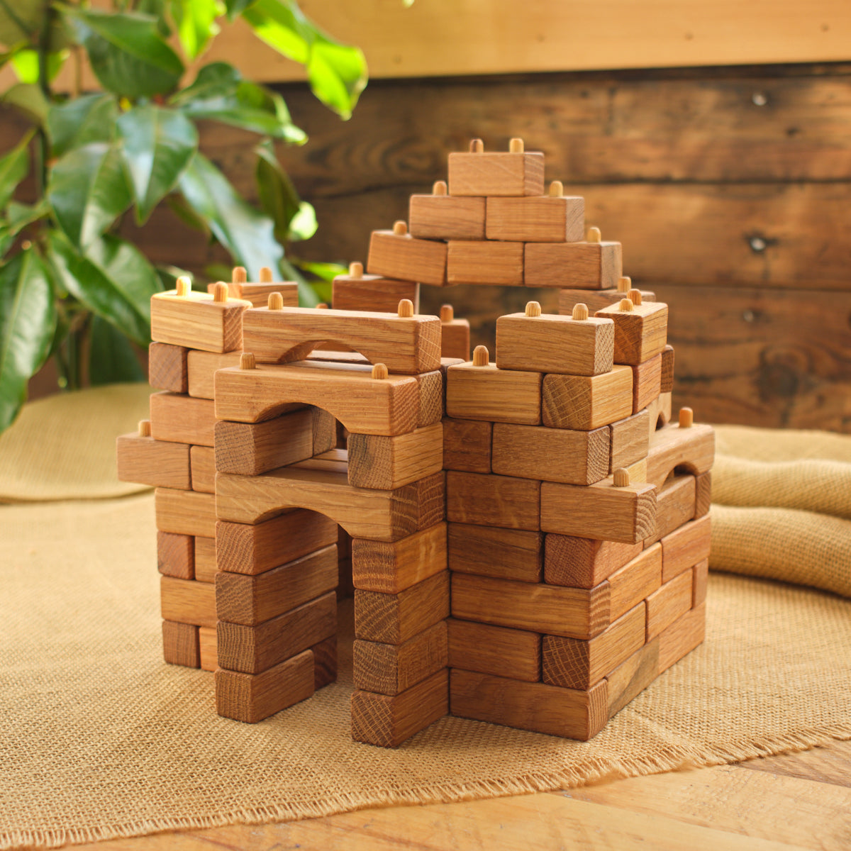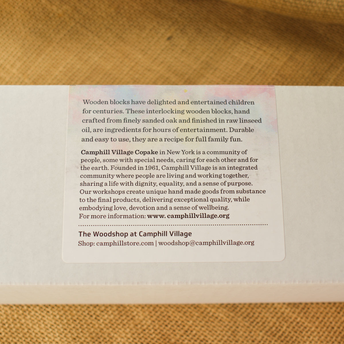 Wooden blocks have delighted and entertained children for centuries. These interlocking wooden blocks, hand crafted from finely sanded oak and finished in raw linseed oil, are ingredients for hours of entertainment. Durable and easy to use, they are a recipe for full family fun.