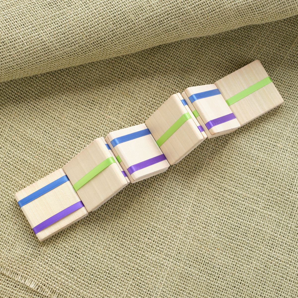 The basic movement of the Jacob's Ladder begins by letting the toy hang straight down. Hold the top block on the edges, with the ribbon facing out. Tip the top brick forward, until it touches the next brick. Then, tip it back again; it will appear to cascade down once more.