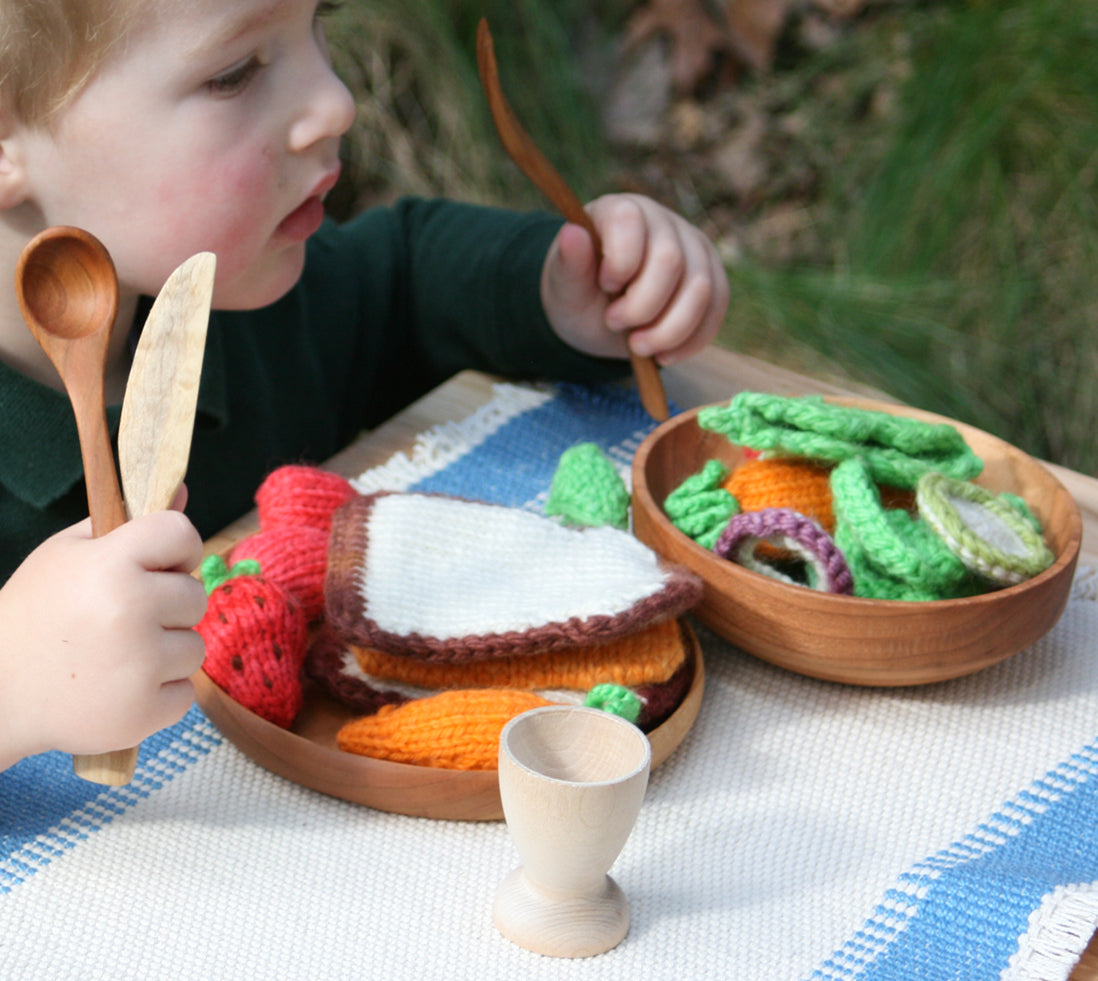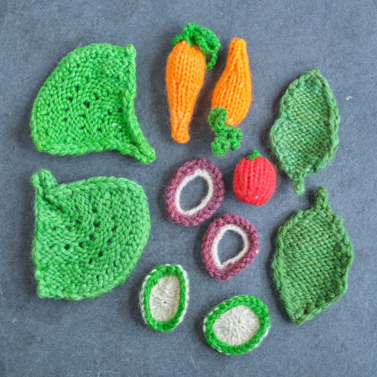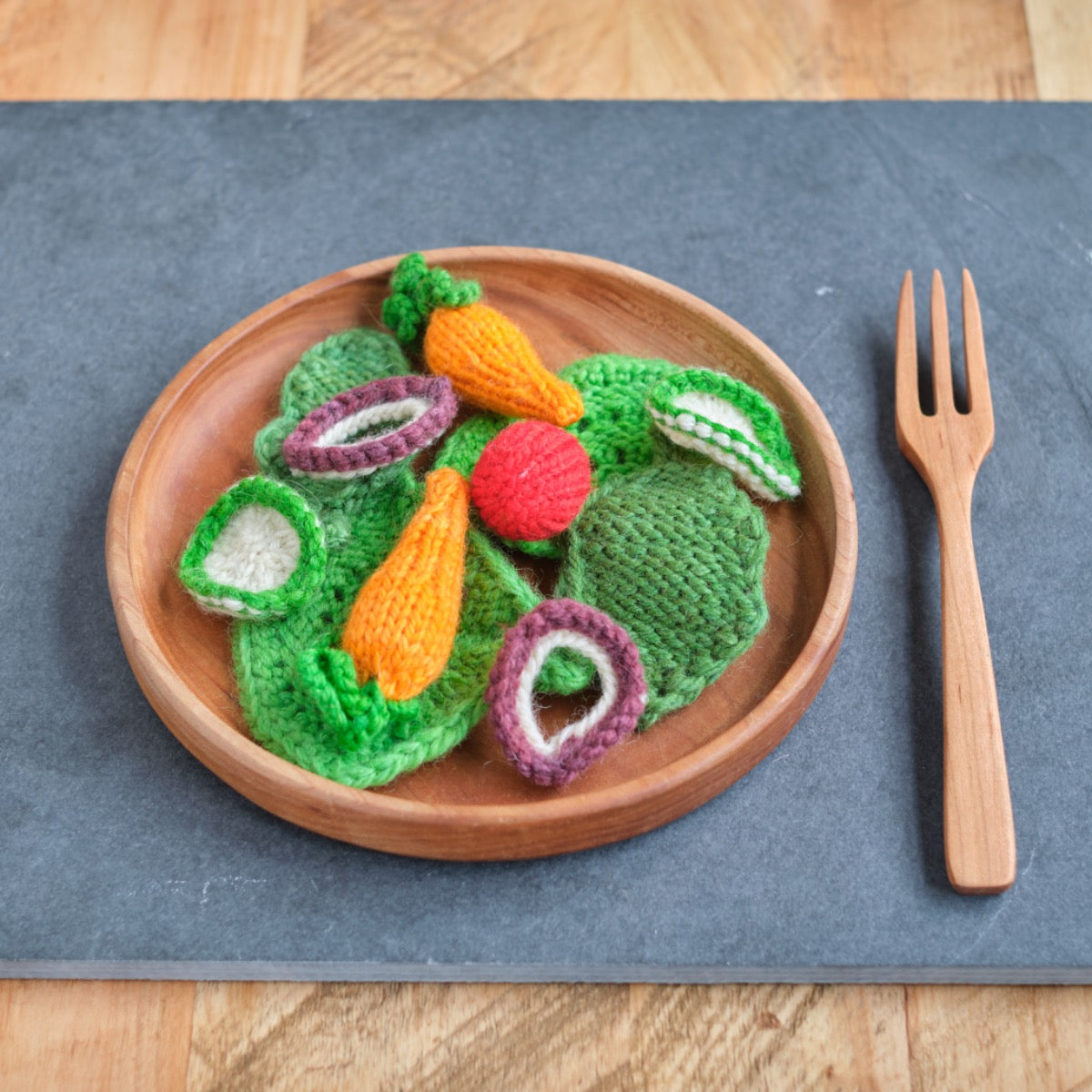 A play food Knitted Vegetable Salad is an ideal addition to any play kitchen, play store, play restaurant, or any other activity. Hand knit from hand spun hand dyed 100% wool and stuffed with wool roving. Packaged in a recycled paper berry basket.