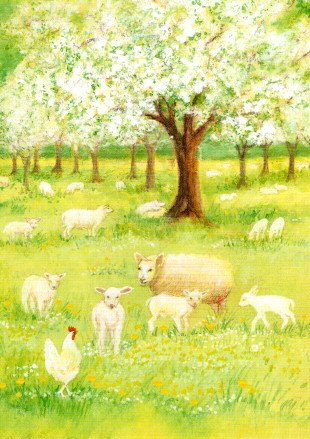 A bright, cheery spring illustration of little lambs in the orchard by European artist Marjan van Zeyl. This postcard will make a great addition to your nature table, inspire the walls of your home/classroom, use as postcards or to just give as gifts.