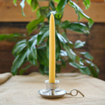 This Chamber Stick is just the little light you need! Perfect for a nature table or celebrations. It does fit our 10" tall beeswax taper candles, 7/8" diameter. The candle will fit a little loose but when it melts it will snuggle into the candle cup with the melted wax.