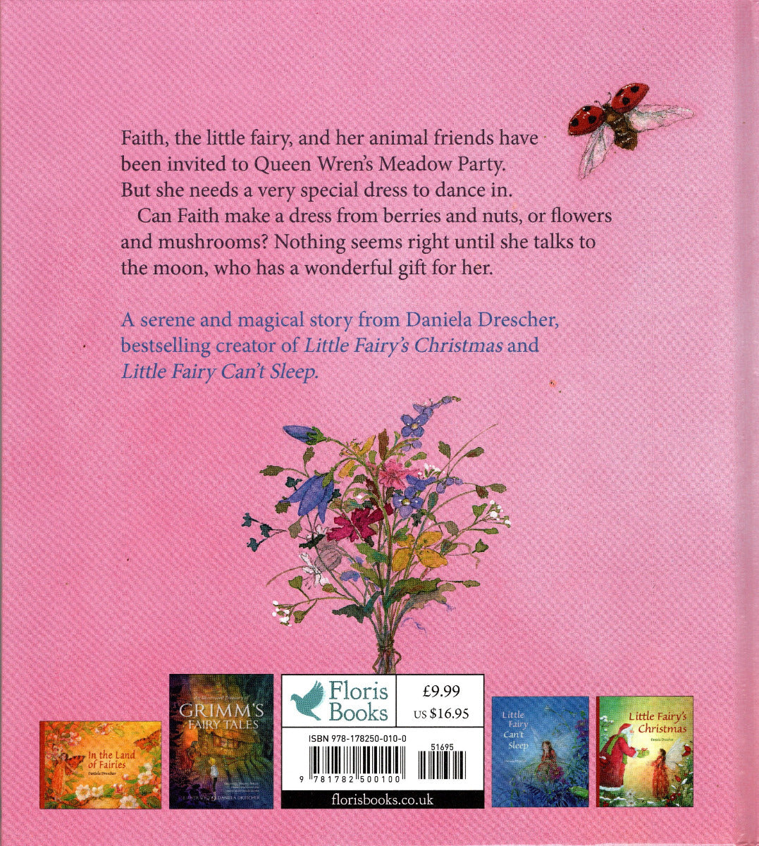 Faith, The little fairy, and her animal friends have been invited to Queen Wren's Meadow Party. But she needs a very special dress to dance in. Can she make a dress from berries and nuts, or flowers and mushrooms? Nothing seems right until she talks to the moon, who has a wonderful gift for her. A serene and magical story from Daniela Drescher, bestselling illustrator of Little Fairy Can't Sleep and In The Land of Fairies.