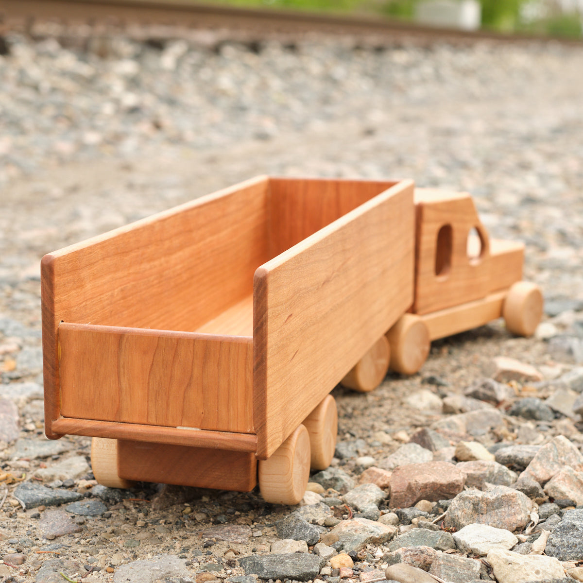 Semi-trucks are one of the most requested items, no matter what the age. Our cherry wood truck is built for hours of endless play. Just the right size to be pushed around by a children's hands, this wooden Semi-Truck will become a childhood favorite. Let your child get creative with felt balls, wooden balls, marbles, rocks, etc.