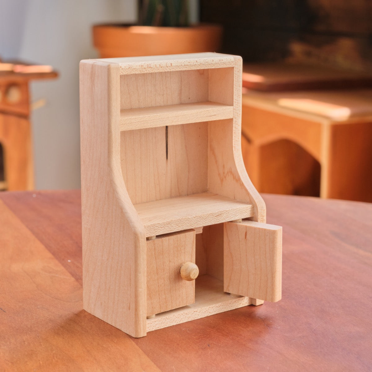 Make your dollhouse a home with this solid maple wood dollhouse furniture! This set includes a fireplace, kitchen sink with cupboard, stove/oven combo, dresser, and a cupboard with hutch. Sized for dolls 5-6" tall. This set fits perfectly in our Maple Wood Dollhouse.