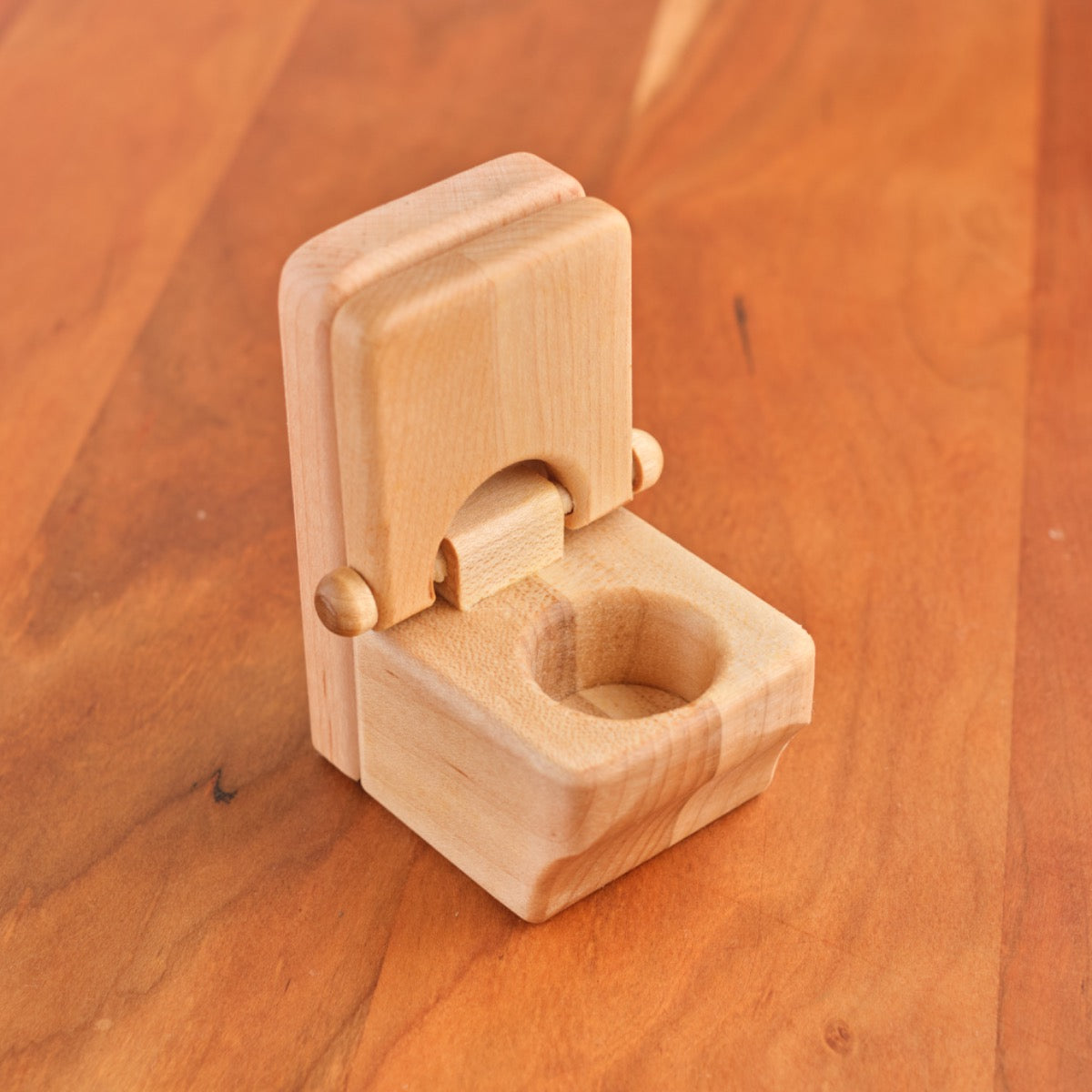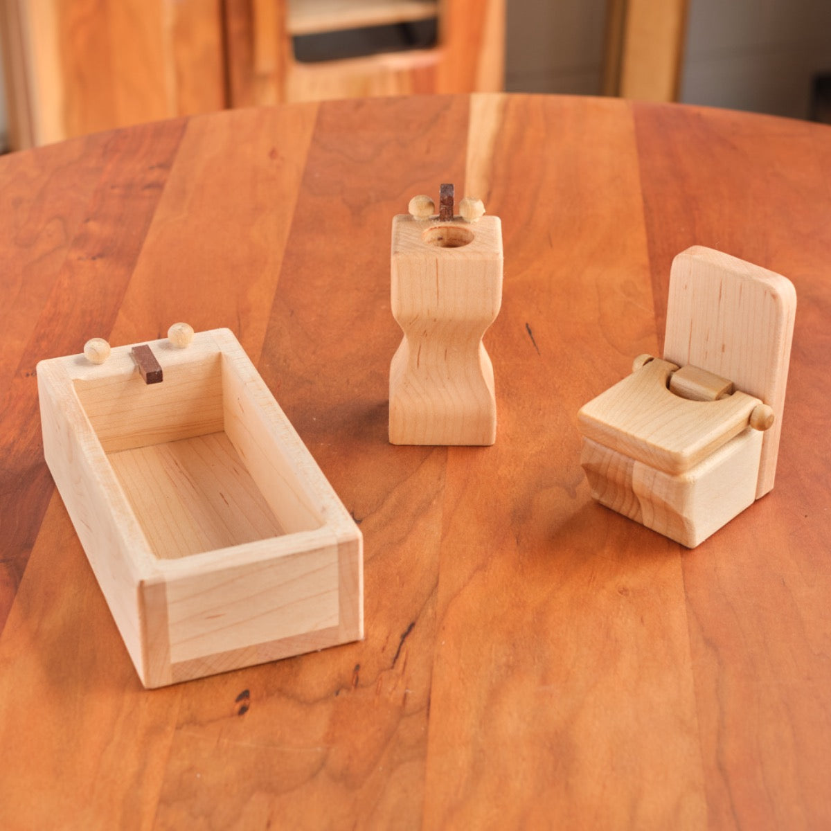 Complete your dollhouse furniture collection with this maple hardwood toilet, bathtub, and sink set with working toilet lid! Faucets are walnut hardwood. Finished with our Three BEEautiful Bees All-Natural beeswax polish.