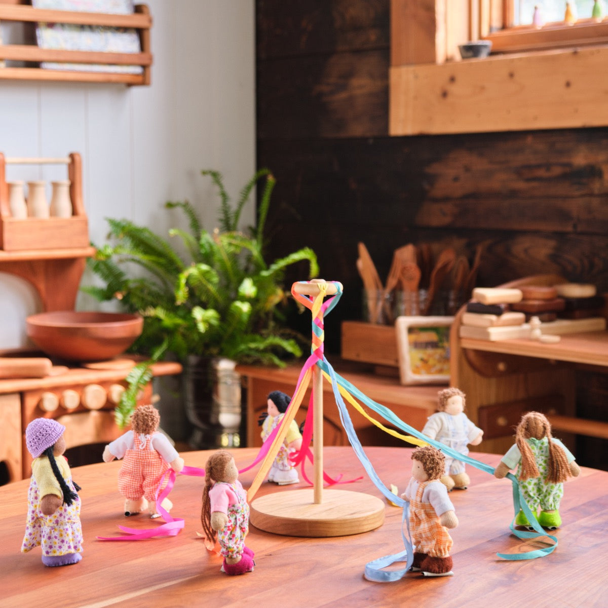 Dress up your nature table with our colorful Maypole! Made of cherry and birch hardwoods and 100% silk ribbon. With friend or family, weave the ribbons around the pole as you would with a life-sized outdoor maypole. A beautiful Spring tradition.