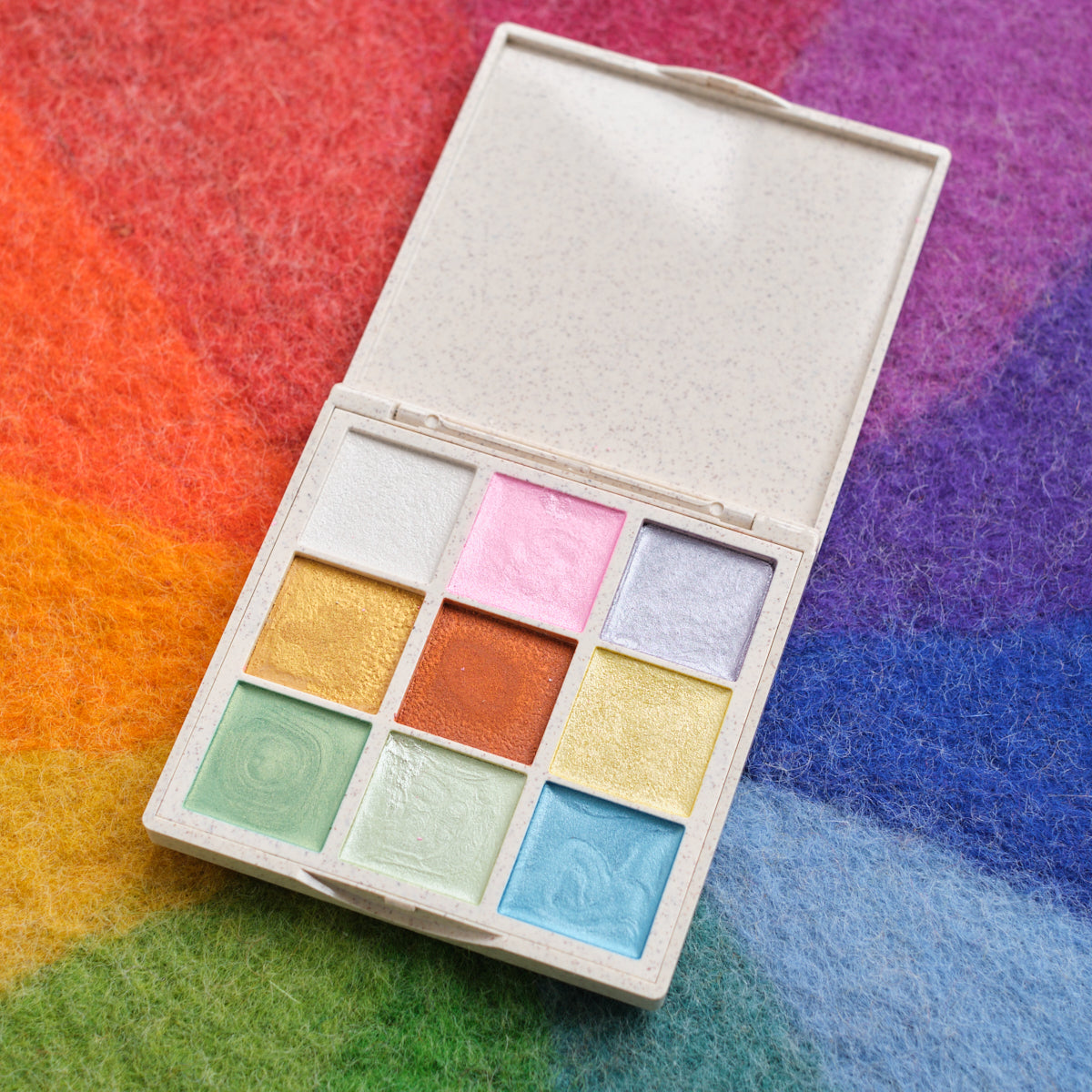 These nine shimmering shades of hand-poured metallic watercolors will delight artists of all ages. With a dazzling luster from pearlescent pigments, they offer beautiful multi-dimensional reflections.