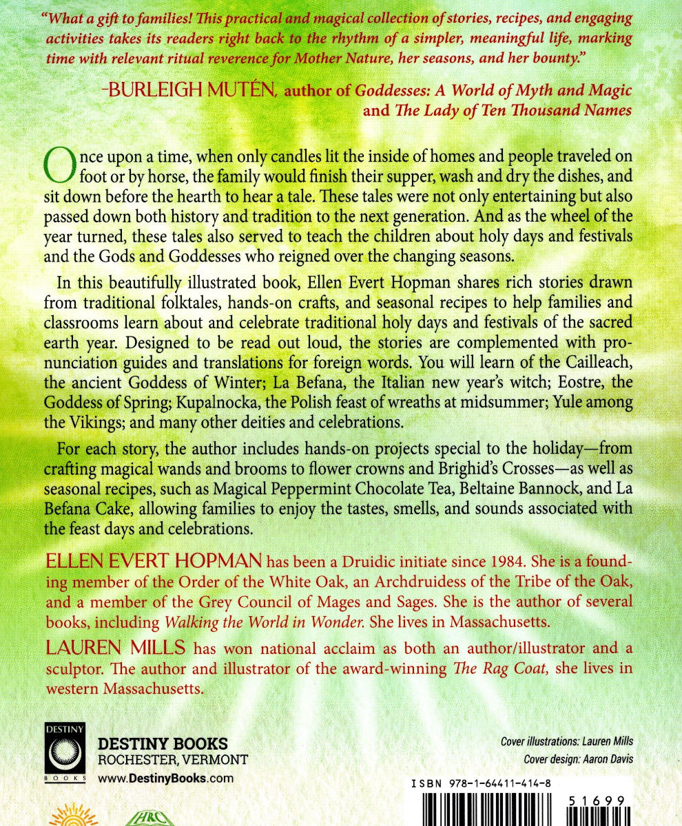 In this beautifully illustrated book, Ellen Evert Hopman shares rich stories drawn from traditional folktales, hands-on crafts, and seasonal recipes to help families and classrooms learn about and celebrate traditional holy days and festivals of the scared earth year. Designed to be read out loud, the stories are complemented with pronunciation guides and translations for foreign words. You will learn of the Cailleach, the ancient Goddess of Winter; La Befana, the Italian new year's witch; Eostre, the Goddess of Spring; Kupalnocka, the Polish feast of wreaths at midsummer; Yule among the Vikings; and many other deities and celebrations.
