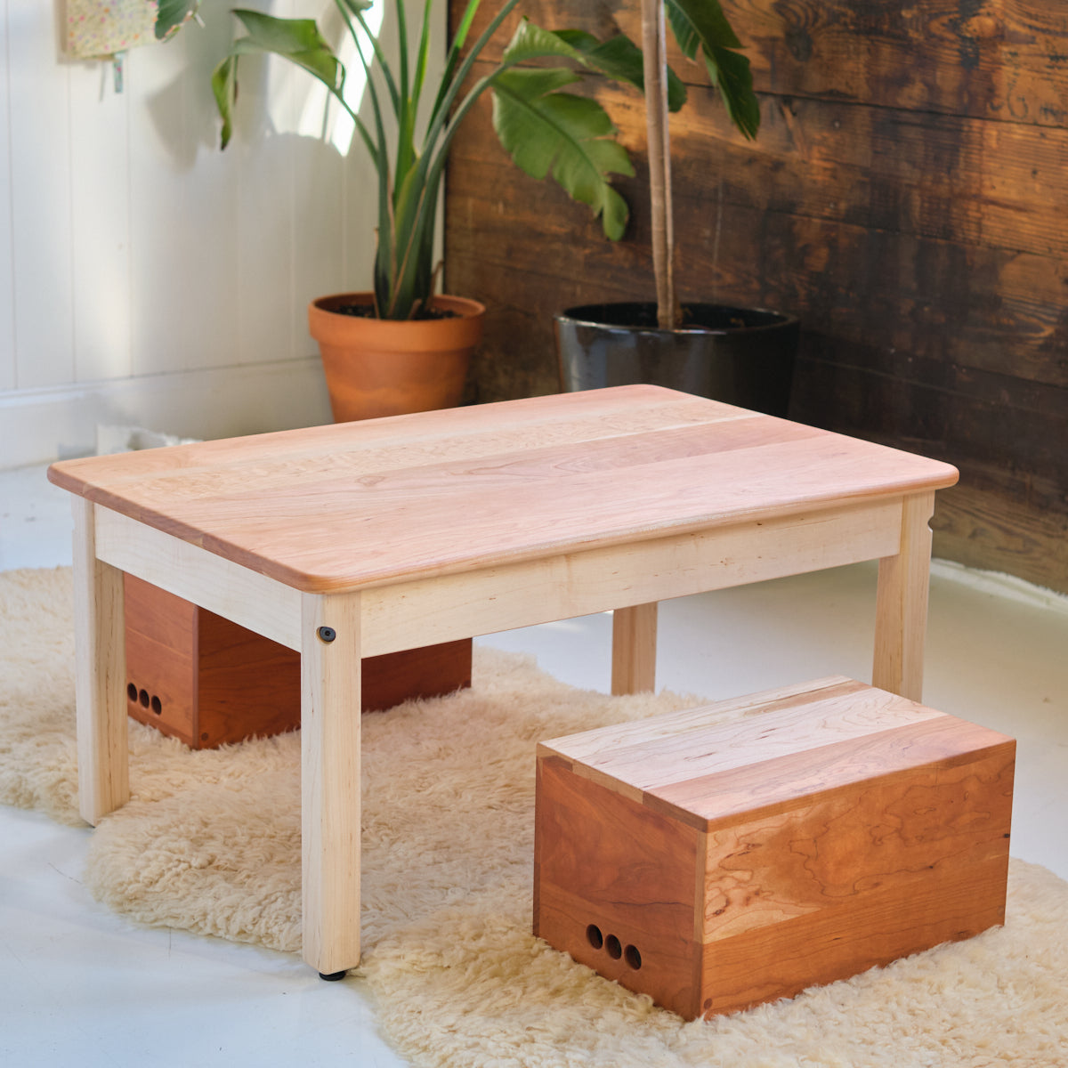 A simple, well constructed Toddler Play Table for block and train play, coloring, or snack time. Just the right height for toddlers, our solid cherry wood Play Table with maple legs and two cherry wood storage crates keep toys organized. As your child grows, simply replace the short maple legs for longer ones to extend the table's use.