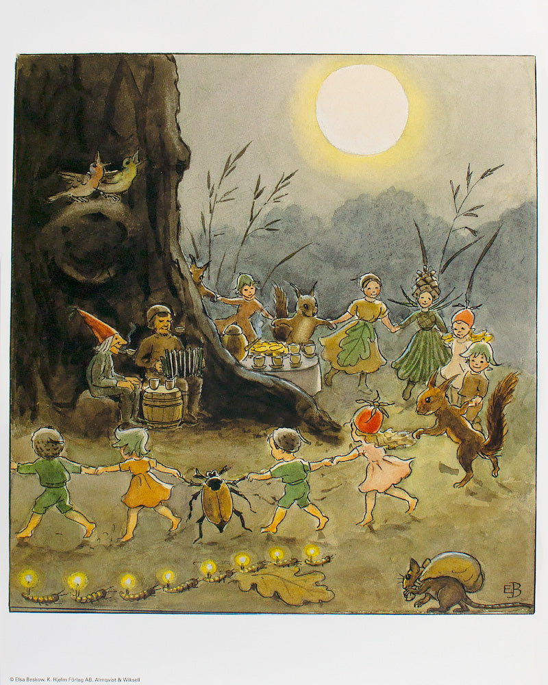 This sweet poster is taken from the party scene at the end of Elsa Beskow Book, "Woody, Hazel and Little Pip. Inspire your little one's space with this playful poster or give it as a gift to someone special.
