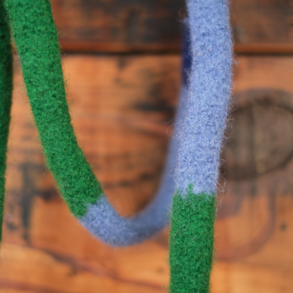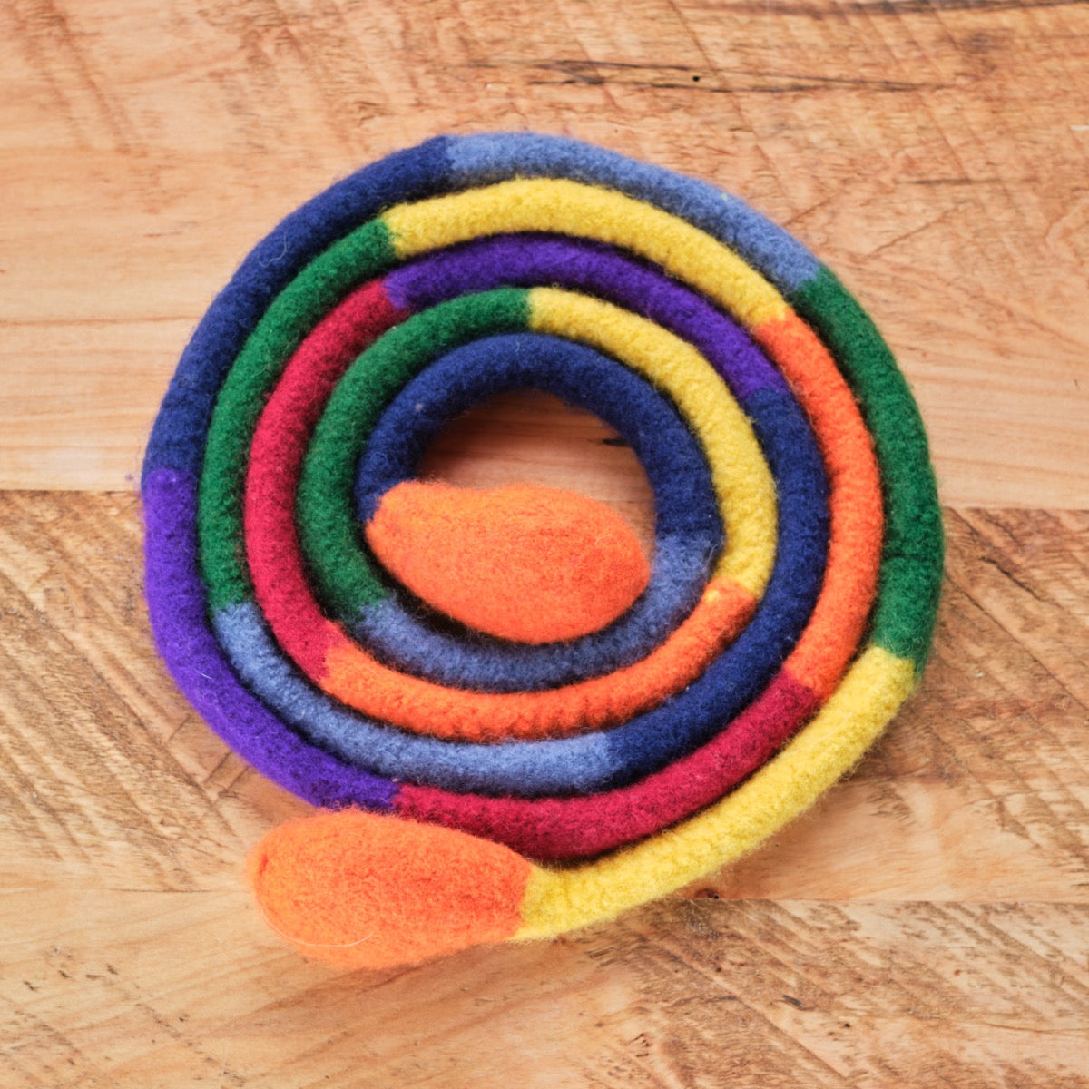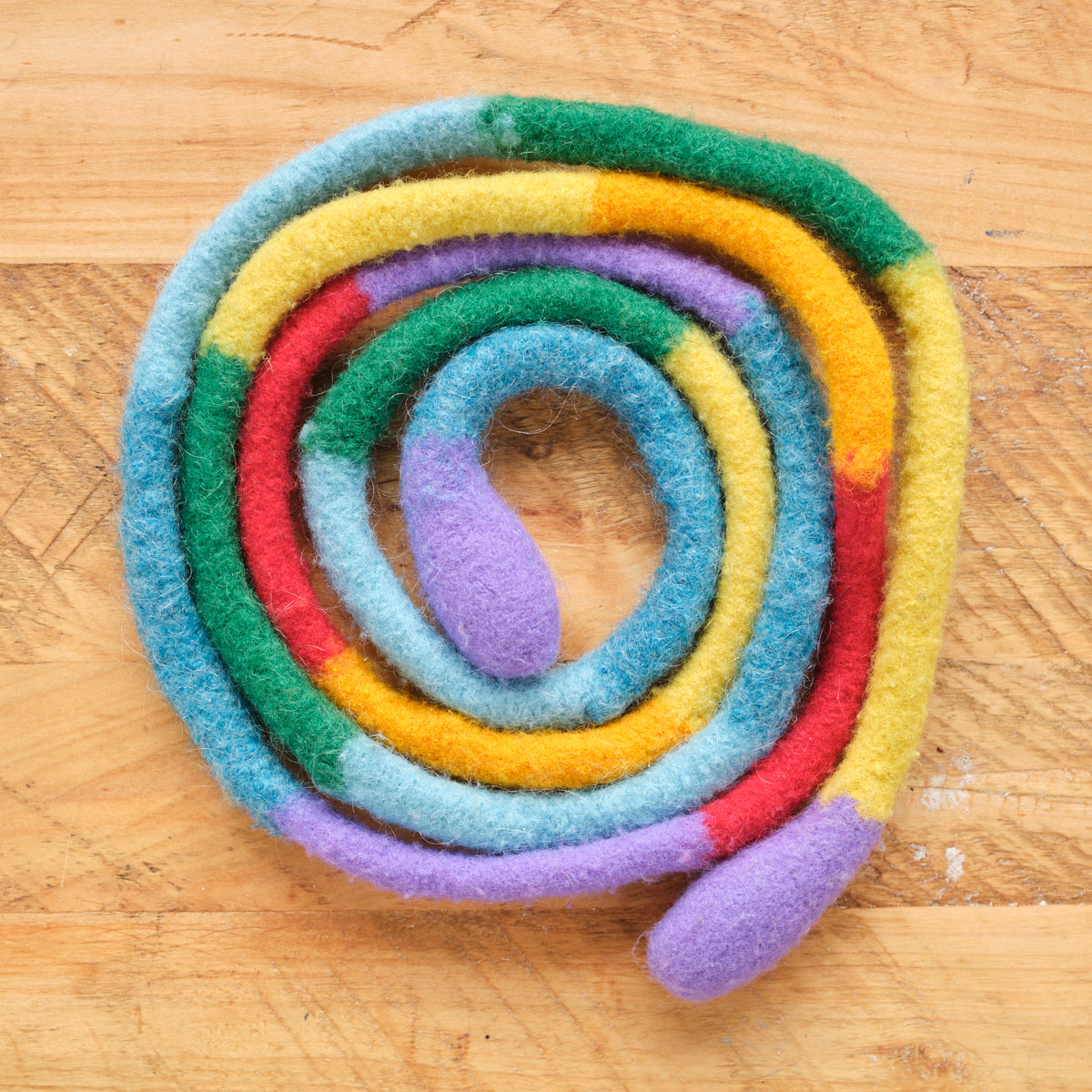 Our Rainbow Jump Rope is knitted into a long rainbow pattern then sturdily felted to withstand tough play. The handles are firmly stuffed with wool for nice grip.