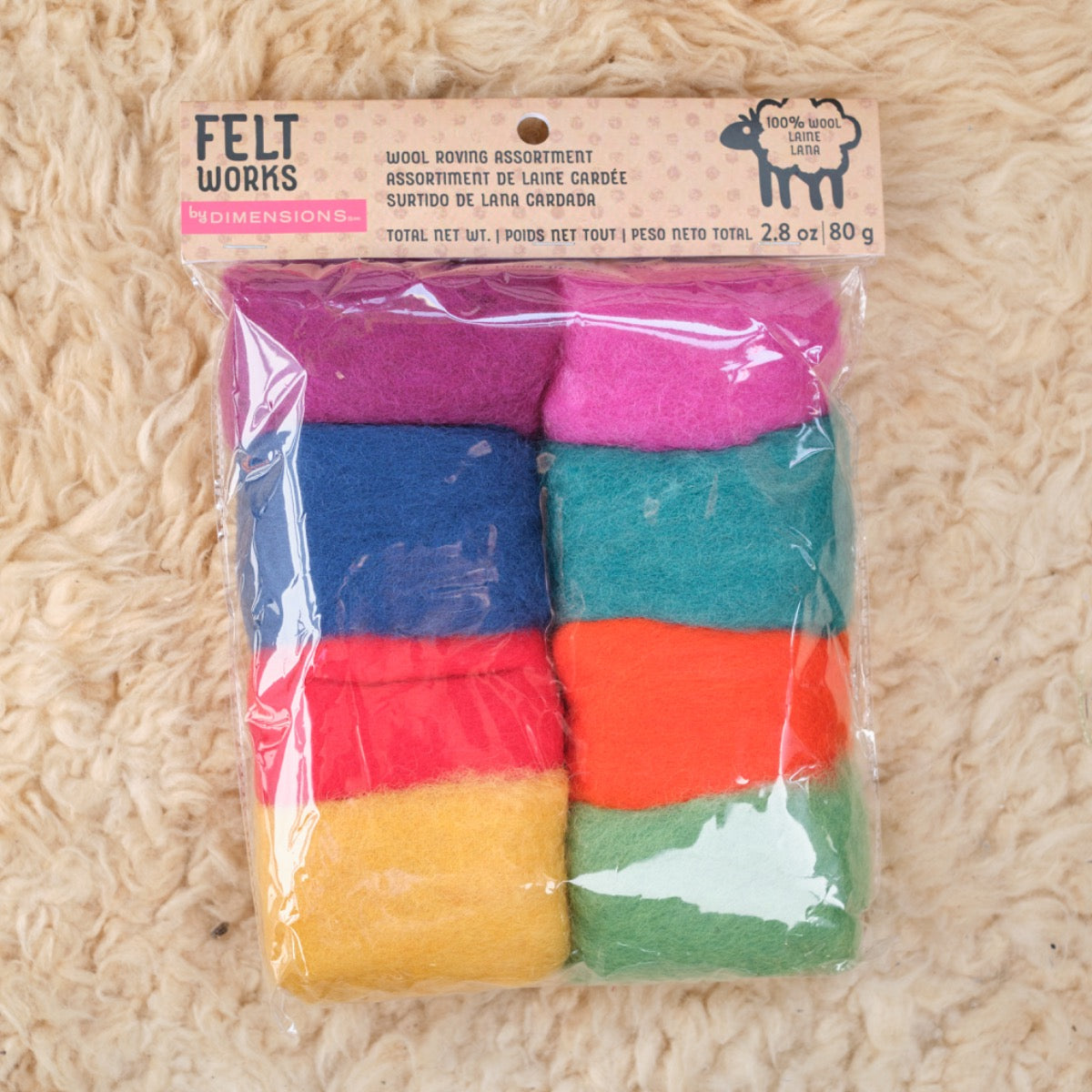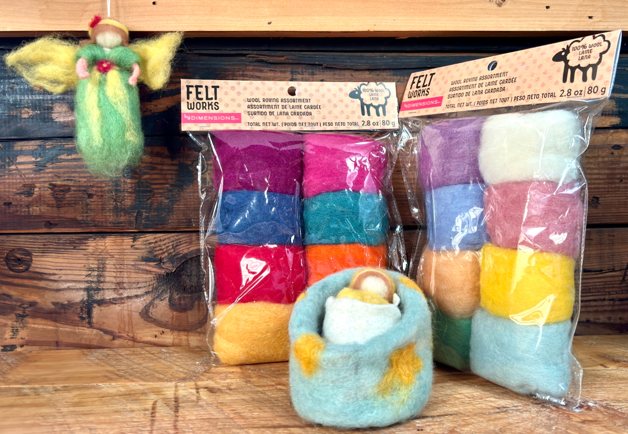 Make your project look even better by adding needle felting work. This Rainbow Wool Roving Pack of 8 by Dimensions is rich and colorful and is perfect for wet felting too! 100% wool roving: spring green, cheddar, orange, tomato, light teal, blueberry, rose, and boysenberry.
