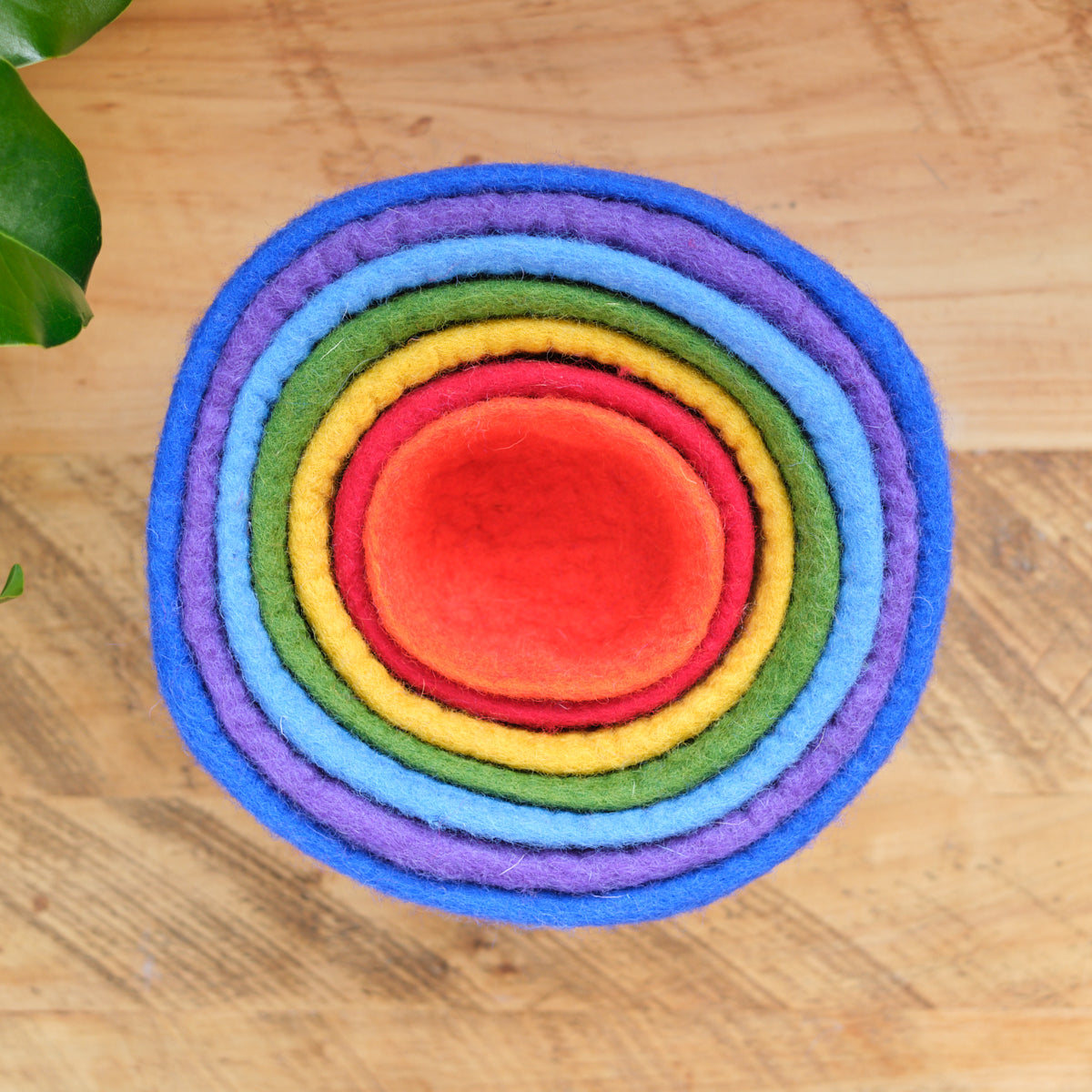 These fillable, stackable, rainbow 100% wool felted nesting bowls will bring cheery fun to any room! Great storage for small items. Includes 7 bowls. Endless possibilities for children!