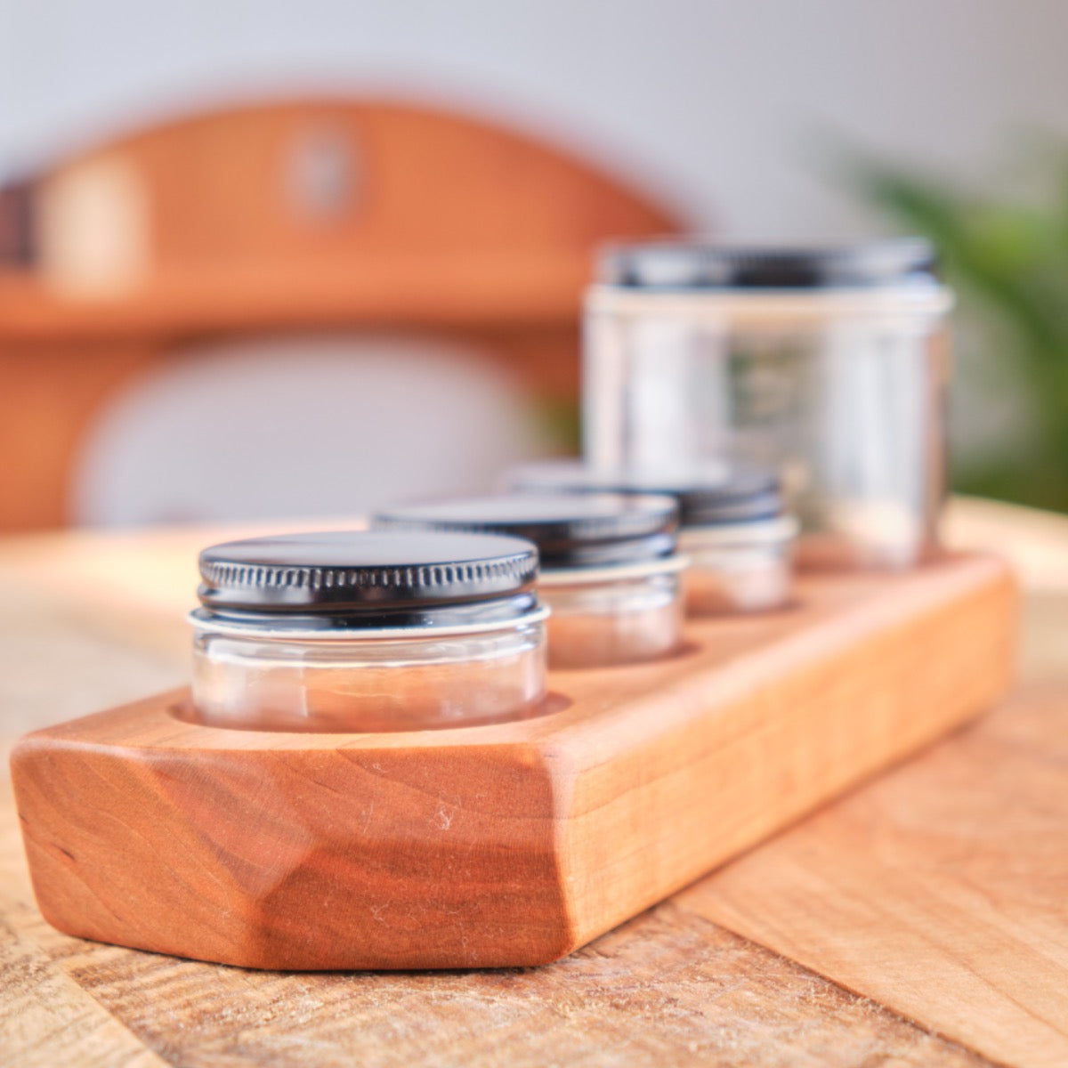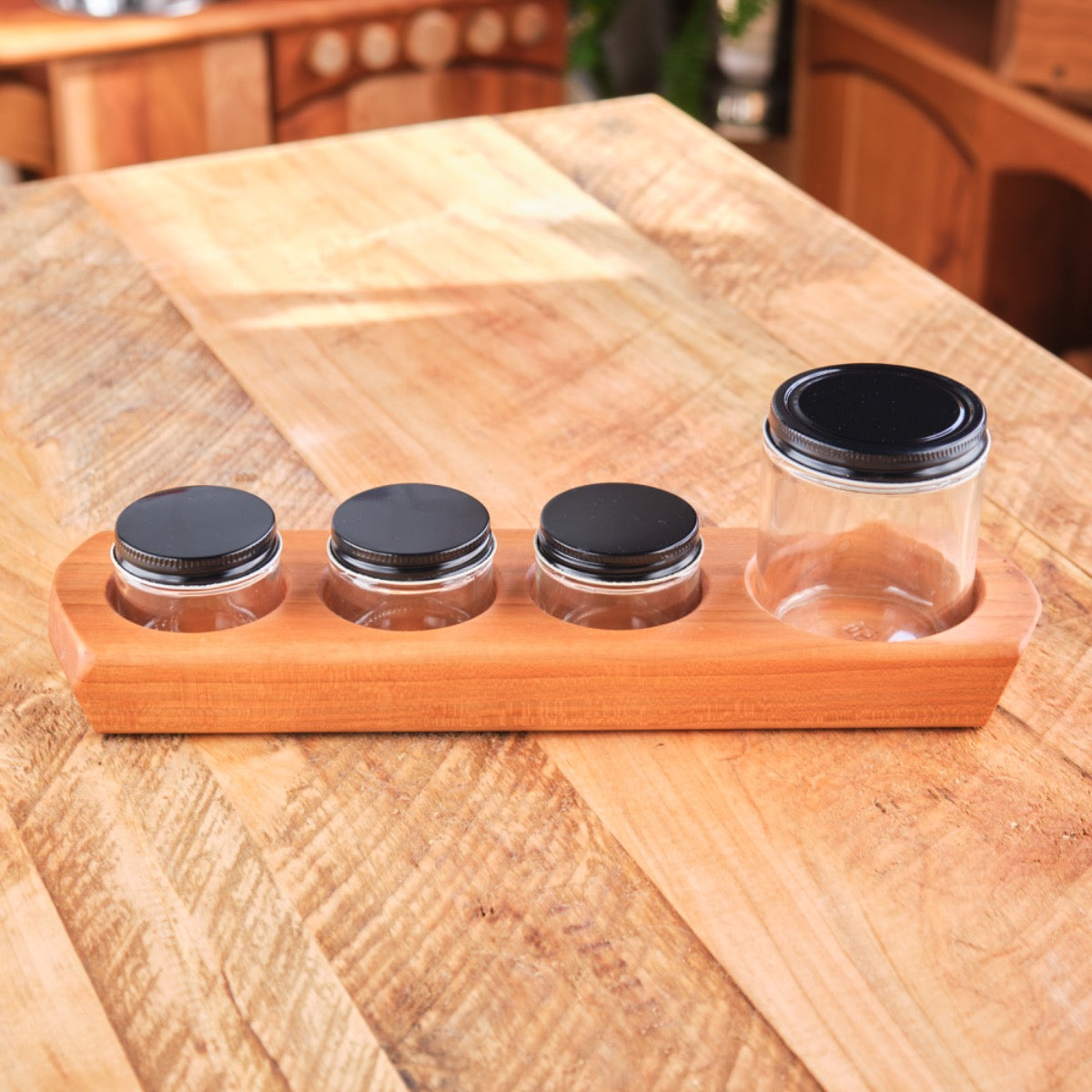 Sculpted Cherry Wood 4 Jar Paint Holder with Glass Jars & Metal Lids