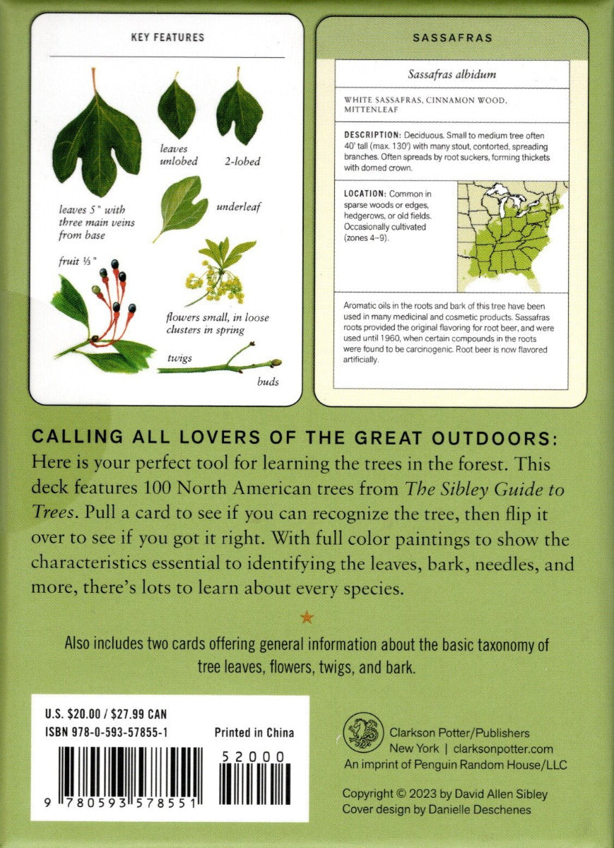 Here is your perfect tool for learning the trees in the forest. This deck features 100 North American trees from The Sibley Guide to Trees. Pull a card to see if you can recognize the tree, then flip it over to see if you got it right. With full color paintings to show the characteristics essential to identifying the leaves, bark, needles, and more, there's lots to learn about every species.