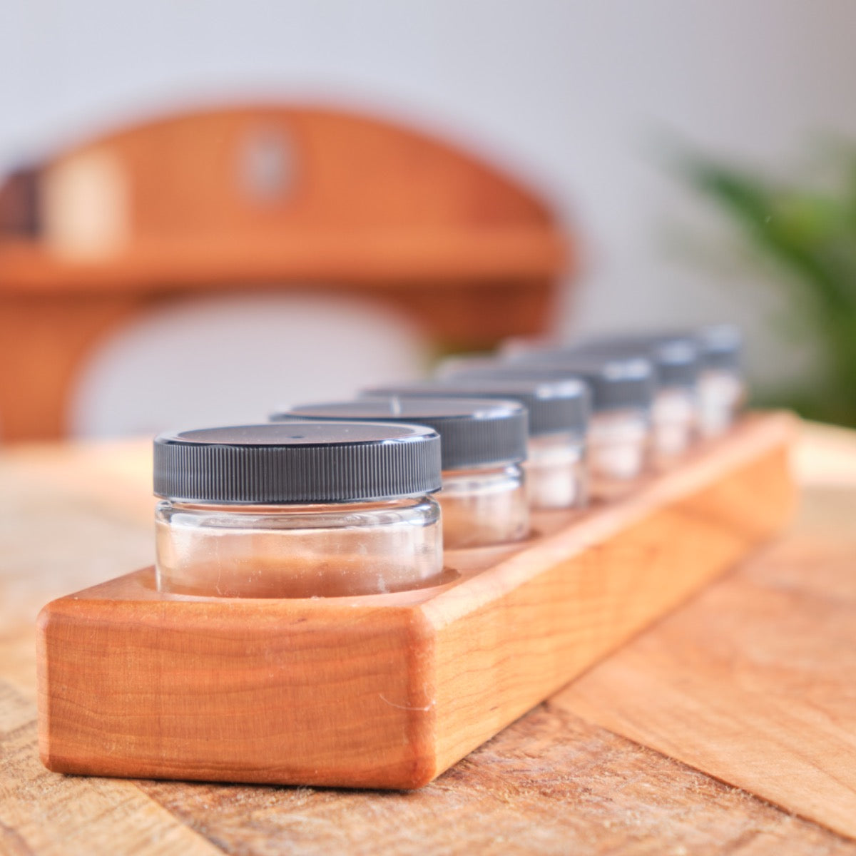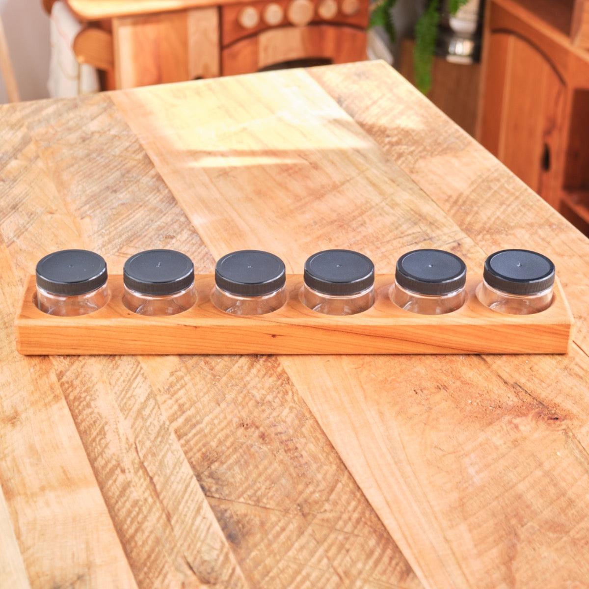 - Materials: Solid cherry wood holder made in USA with 6 - 2 oz. glass jars with plastic lids (Made in India)