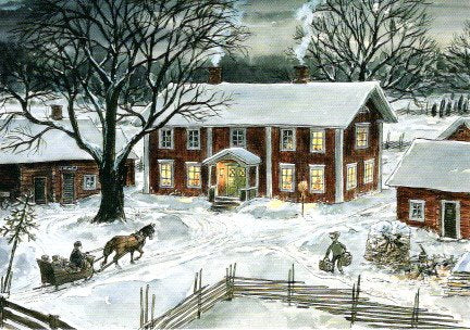 A beautiful snowy, wintry scene complete with horse and sleigh! Illustration by Swedish artist Sven Nordqvist. This postcard will make a great addition to your nature table, inspire the walls of your home/classroom, use as postcard or as a gift.