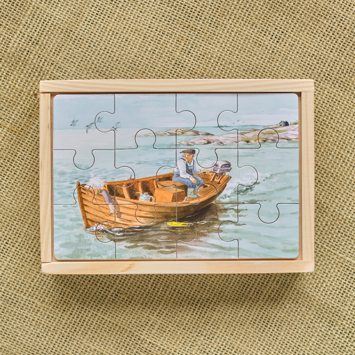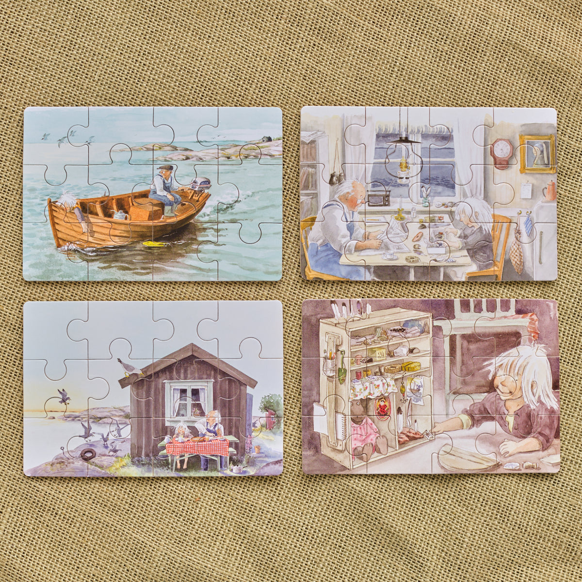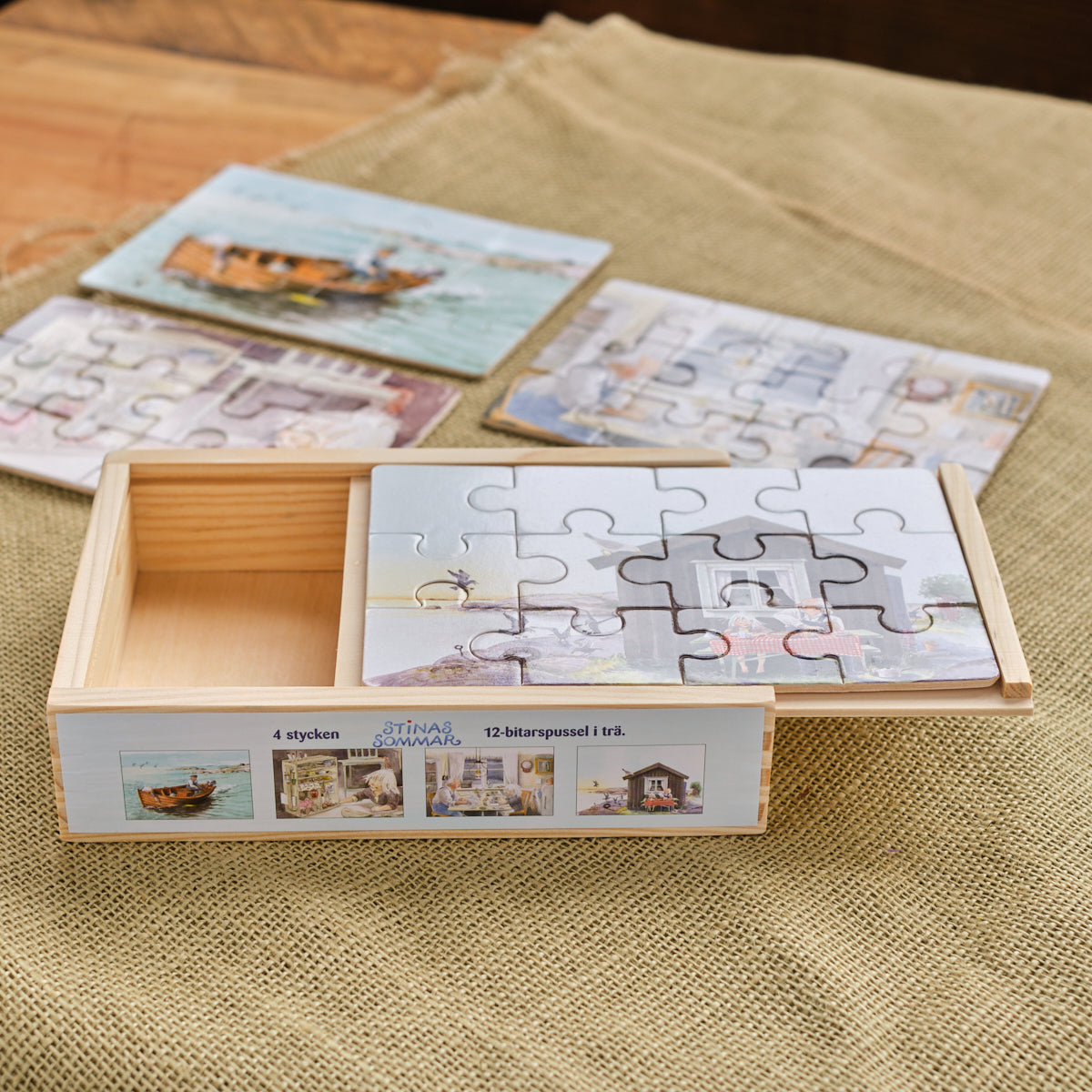 Four different puzzles in one box! Create warm memories around the house on rainy days with this summer Box Puzzle Set. Includes 12 pieces per puzzle, 48 pieces total. Illustrations from Lena Anderson's beloved story Stinas Sommar.