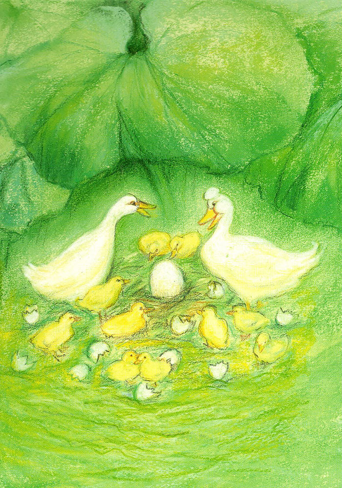 The beautiful watercolor artwork by Marjan van Zeyl will enhance any nature table, adorable ducks with ducklings perusing a very large egg in their nest. Reminisce the famous Ugly Duckling tale.
