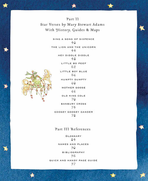 Sing a Song of Sixpence, Humpty Dumpty, Hey Diddle Diddle, and more can all be found here, carousing beneath a sky full of stars.