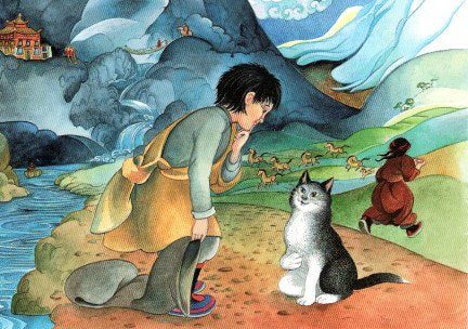 Three coins, three wishes, a folding magic wand, and a clever cat accompany an earnest young boy during his magical journey. Illustration from the book The Three Silver Coins: A Story from Tibet by Veronica Leo and Tashi Daknewa.
