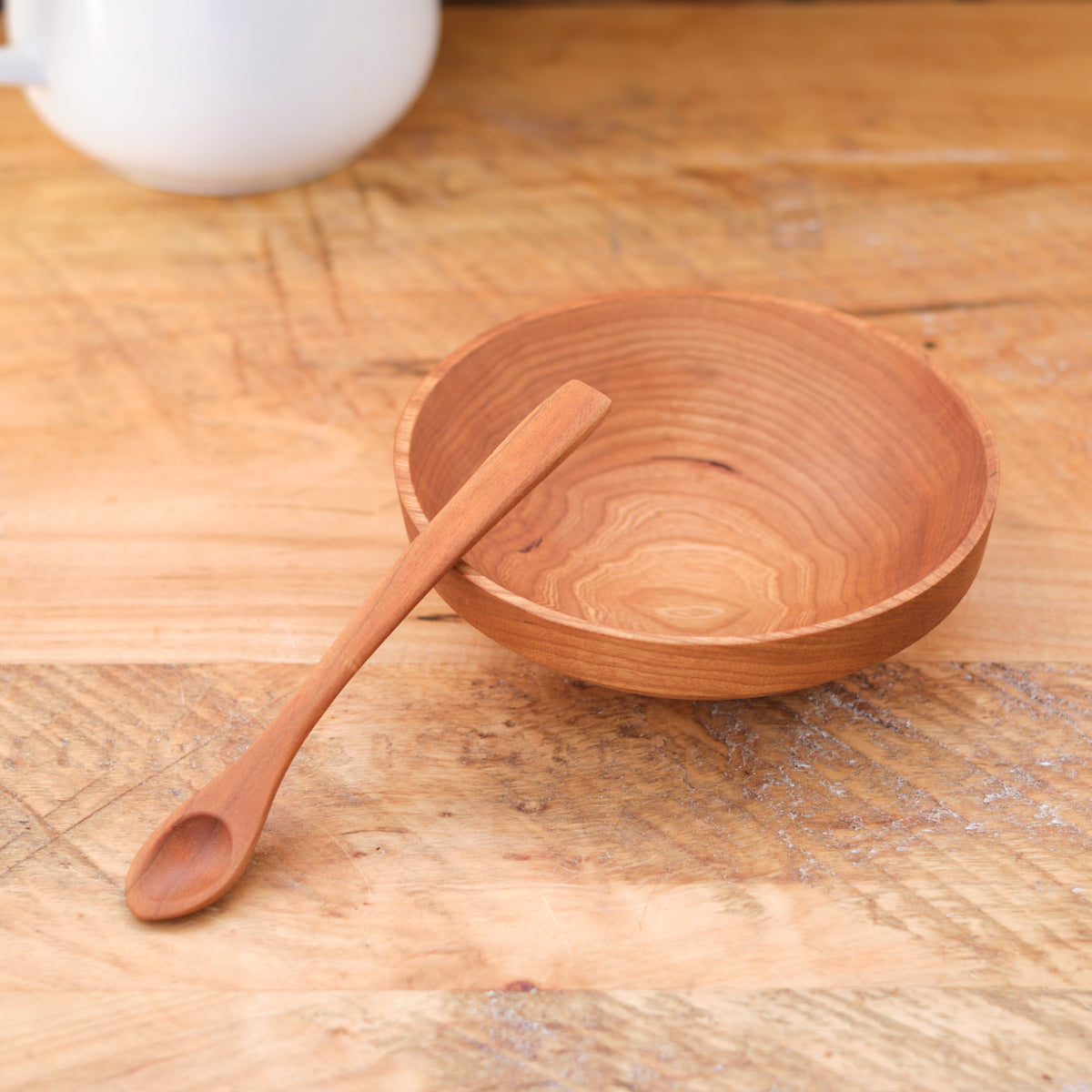 Each bowl is turned from a single piece of premium hardwood in the same tradition. Each wood baby spoon is individually hand-crafted from premium cherry hardwood. Bowls and spoons are sanded silky-smooth and sealed with MOFGA Certified Organic Jojoba Oil.