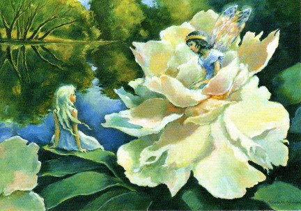 Thumbelina visiting with a flower fairy. Illustration by Elisabeth Nyman, based on Hans Christian Andersen's character, Thumbelina. This postcard will make a great addition to your nature table, inspire the walls of your home/classroom, use as postcard or as a gift.