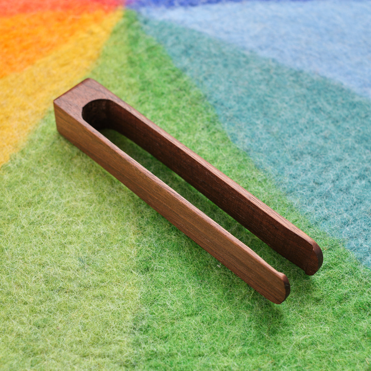 These toaster tweezers are crafted from beautiful walnut wood. Finished with All-Natural Beeswax polish. This is an ergonomically designed tool that teaches a child the proper way to hold utensils and support the development of other fine motor skills.