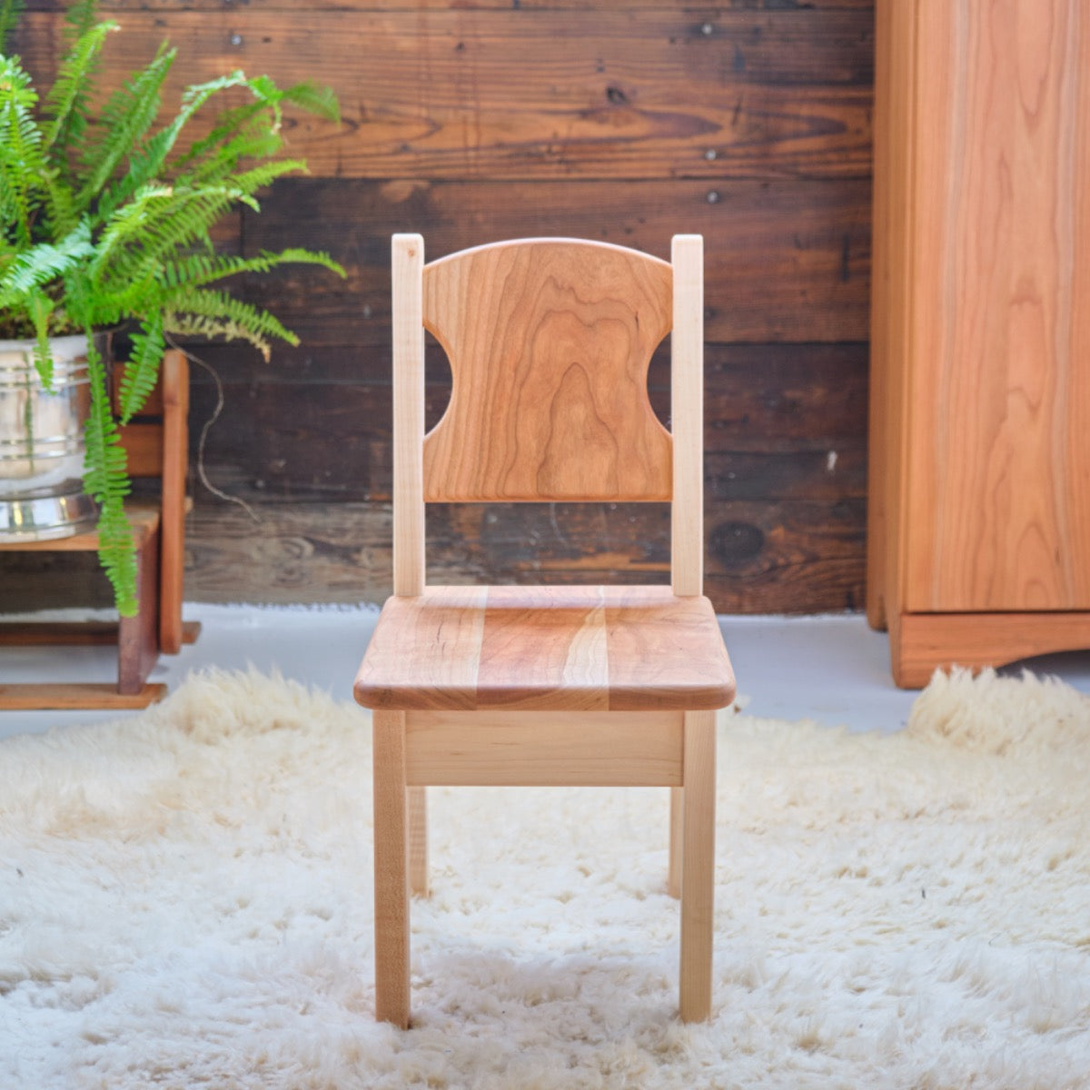 These toddler chairs are a great addition for any playroom or kitchen so younger children can have a space sized just right for them. Or, need extra chairs for your existing set? Designed for children 1-1/2 to 4 years old. We created this heirloom quality chair out of solid cherry hardwood (chair seat & back) and maple hardwood legs.