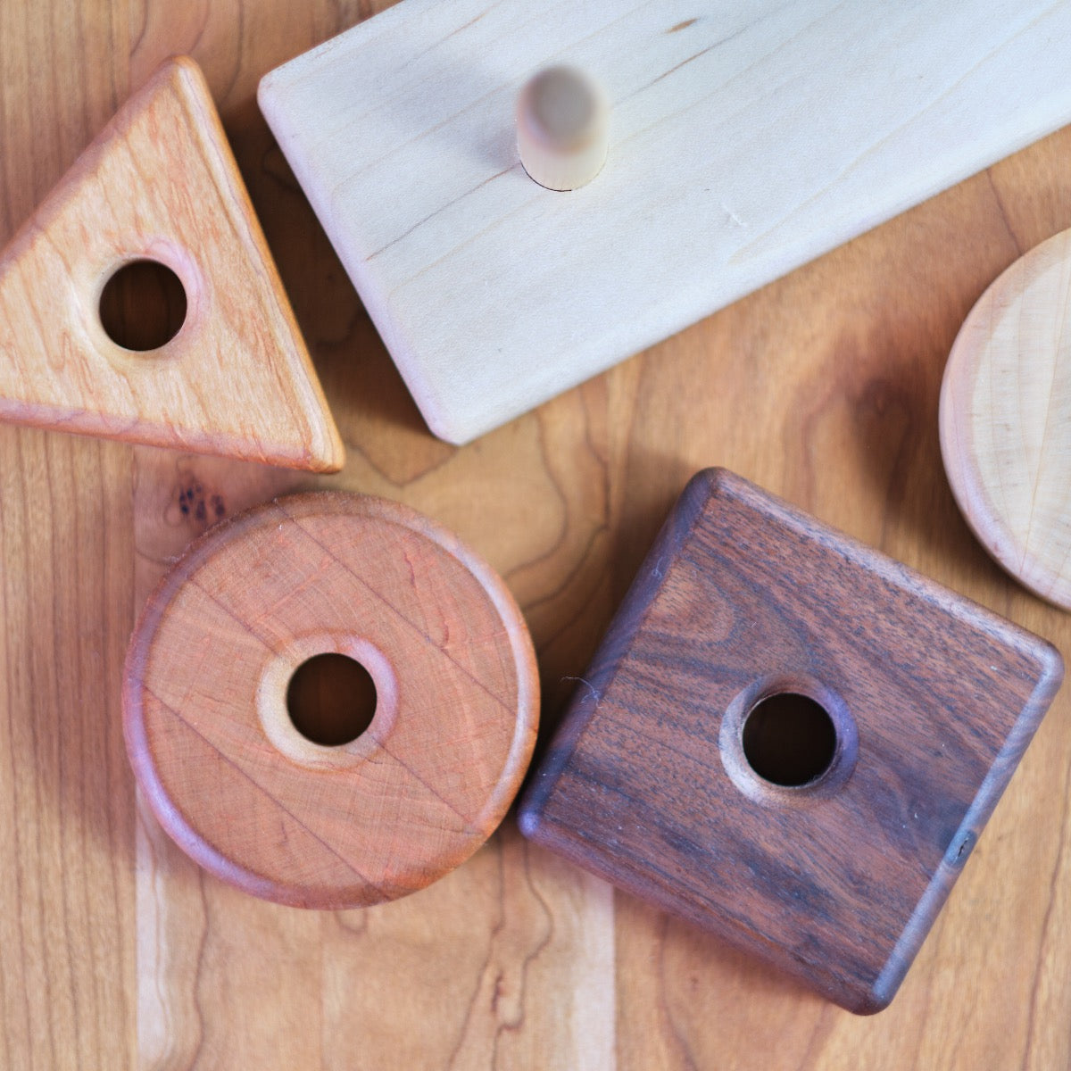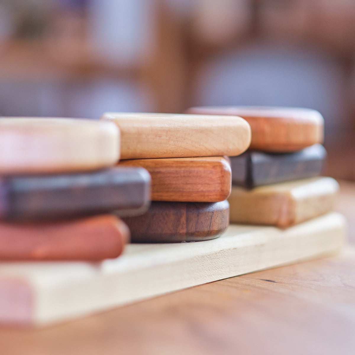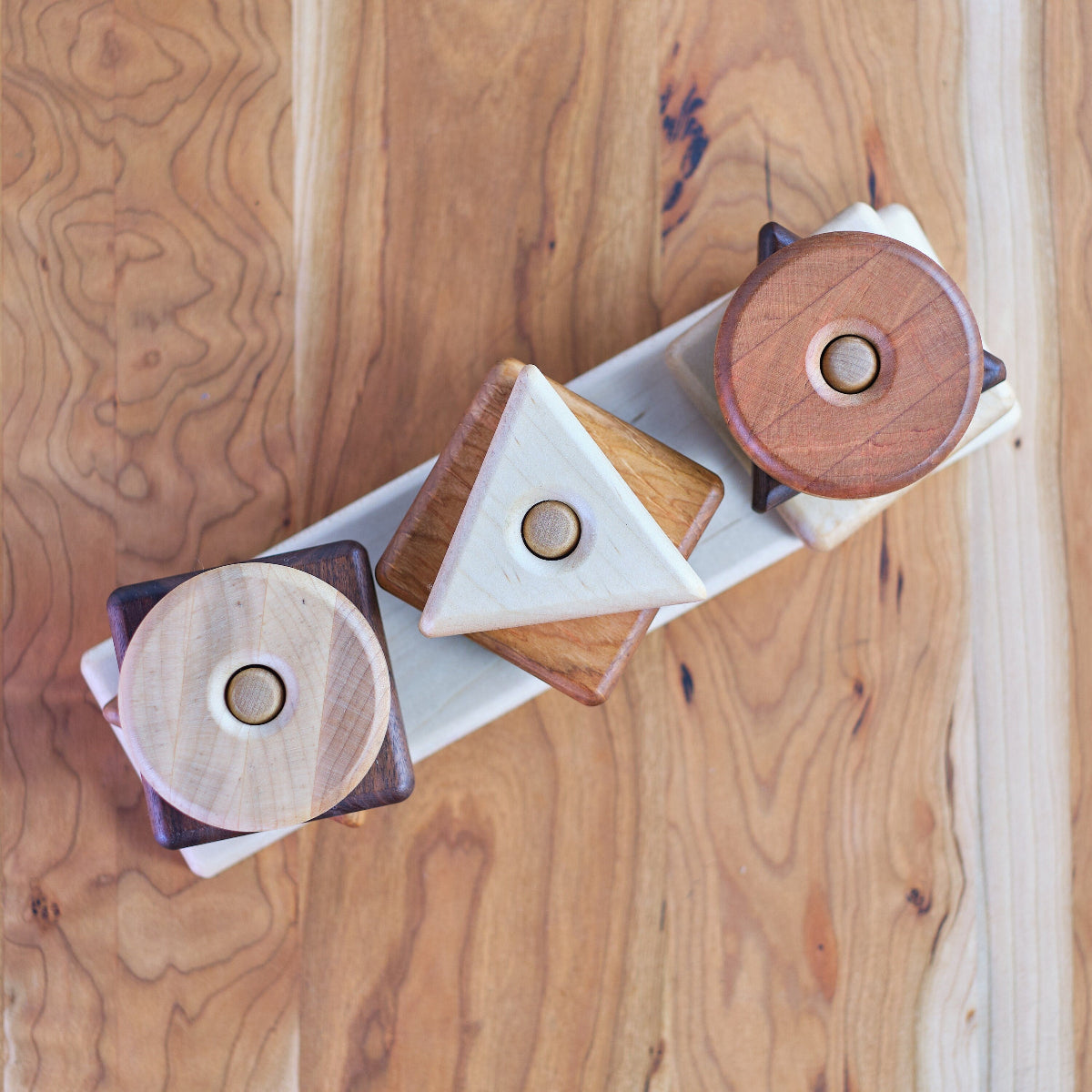 Maple, walnut and cherry wood stackers by Camden Rose promote imagination and build fine motor skills. Finished with our All Natural beeswax polish to enhance the natural beauty of the wood.