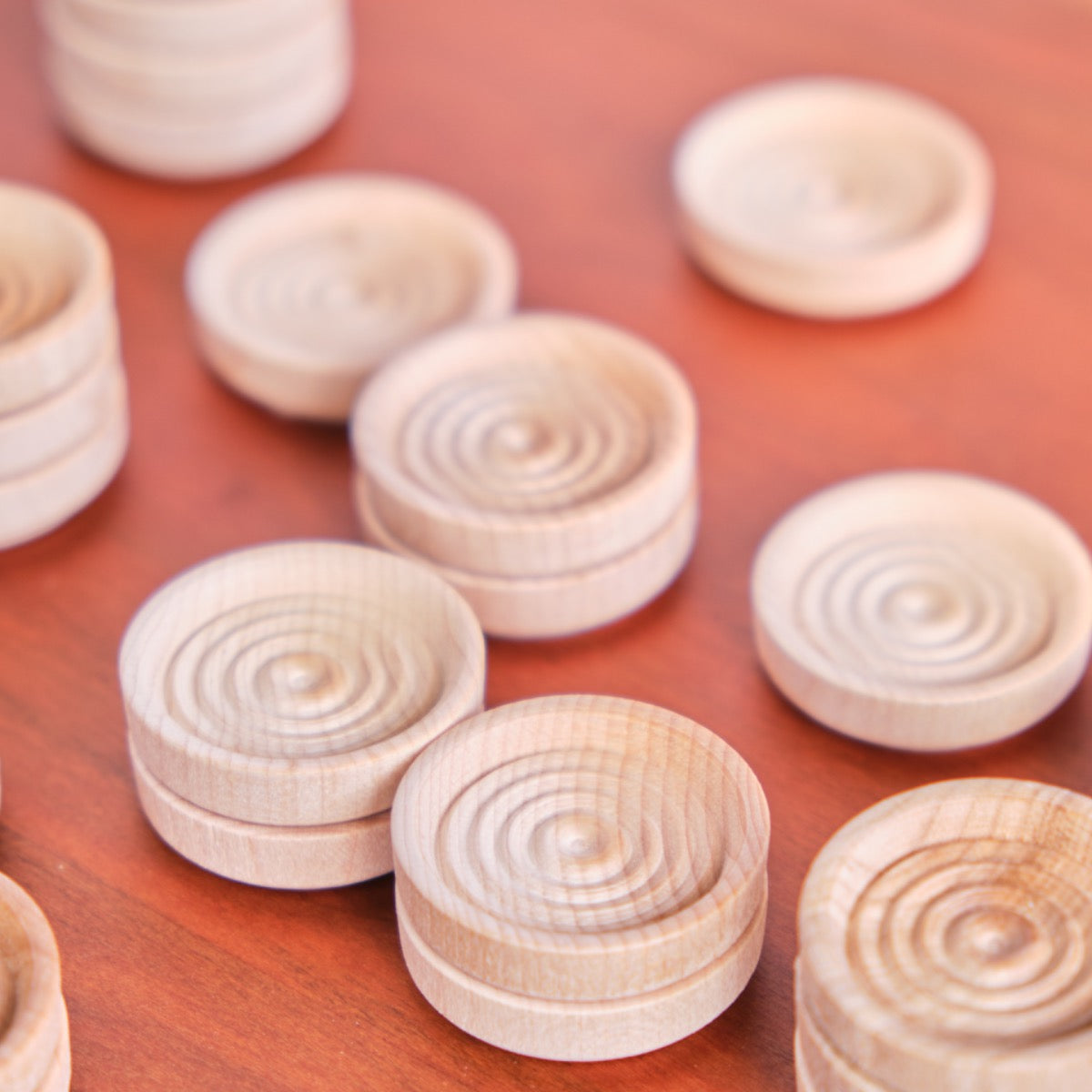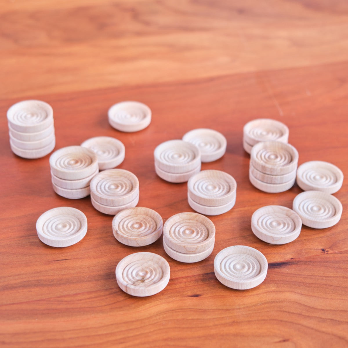 These are unfinished so you can dye/paint them your own unique colors for you special checkers game, etc. A perfect compliment to our maple and walnut checker board. Set includes 26 total checkers.
