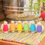 Our six sweet wooden vibrant peg angels with wool felt wings fit in our birthday rings, and dual candle/postcard holder, just remove brass candle insert first. Adorn nature tables, outfit your dollhouse or any other special spot in your home. Made in Michigan.