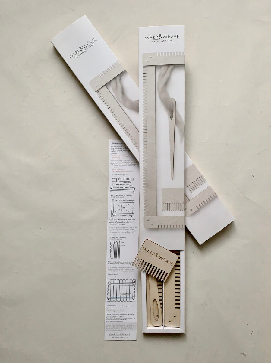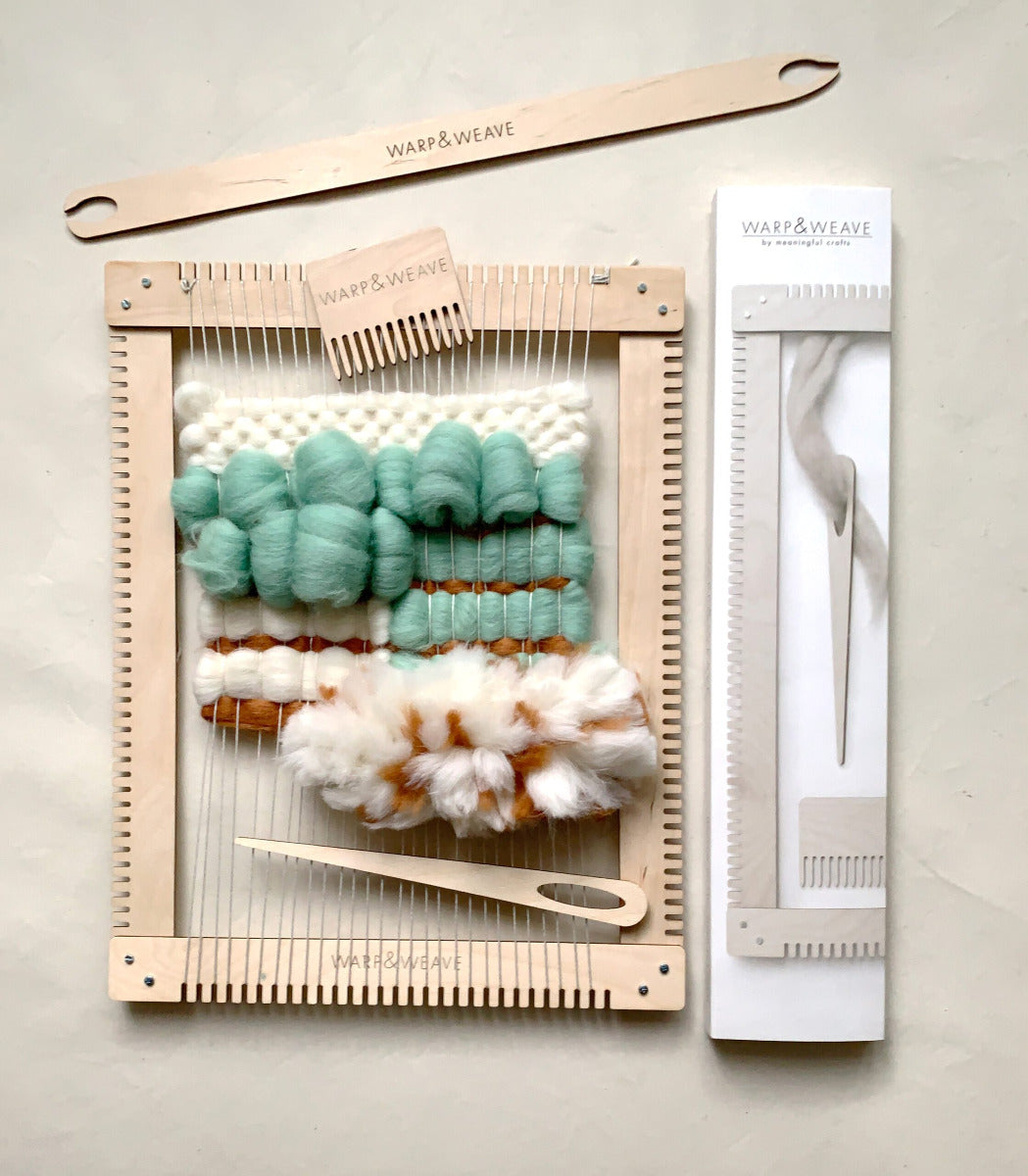 This Warp & Weave weaving set offers all the tools you need to start weaving with yarn, Big Wool, fabrics or even leafs!