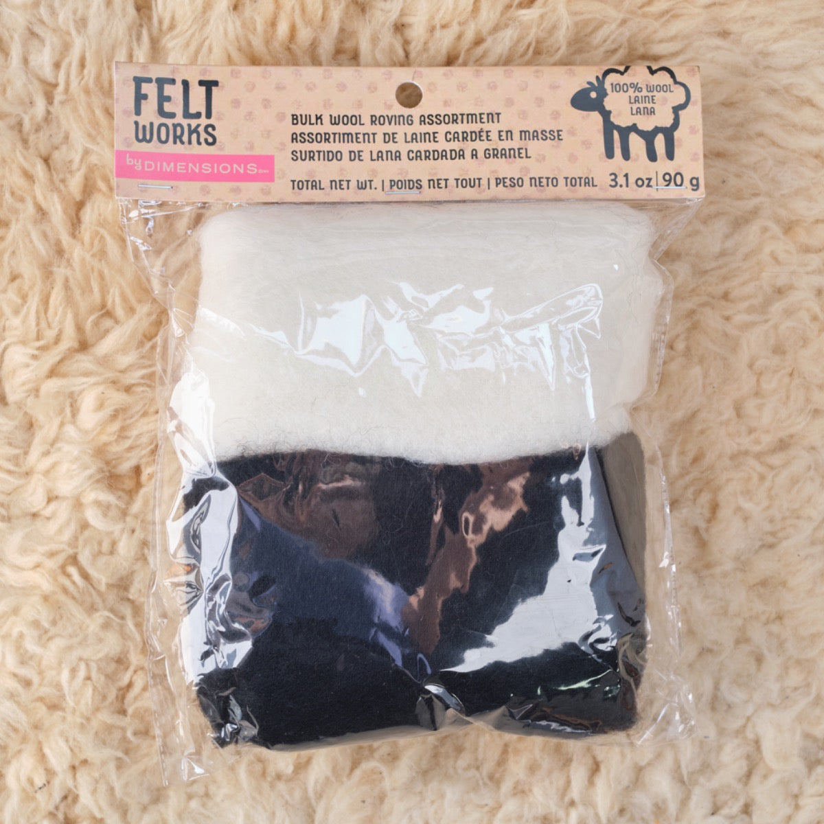 Make your project look even better by adding needle felting work. This Black and White Roving Pack of 2 by Dimensions is perfect for wet felting too! 100% wool roving: black and white.