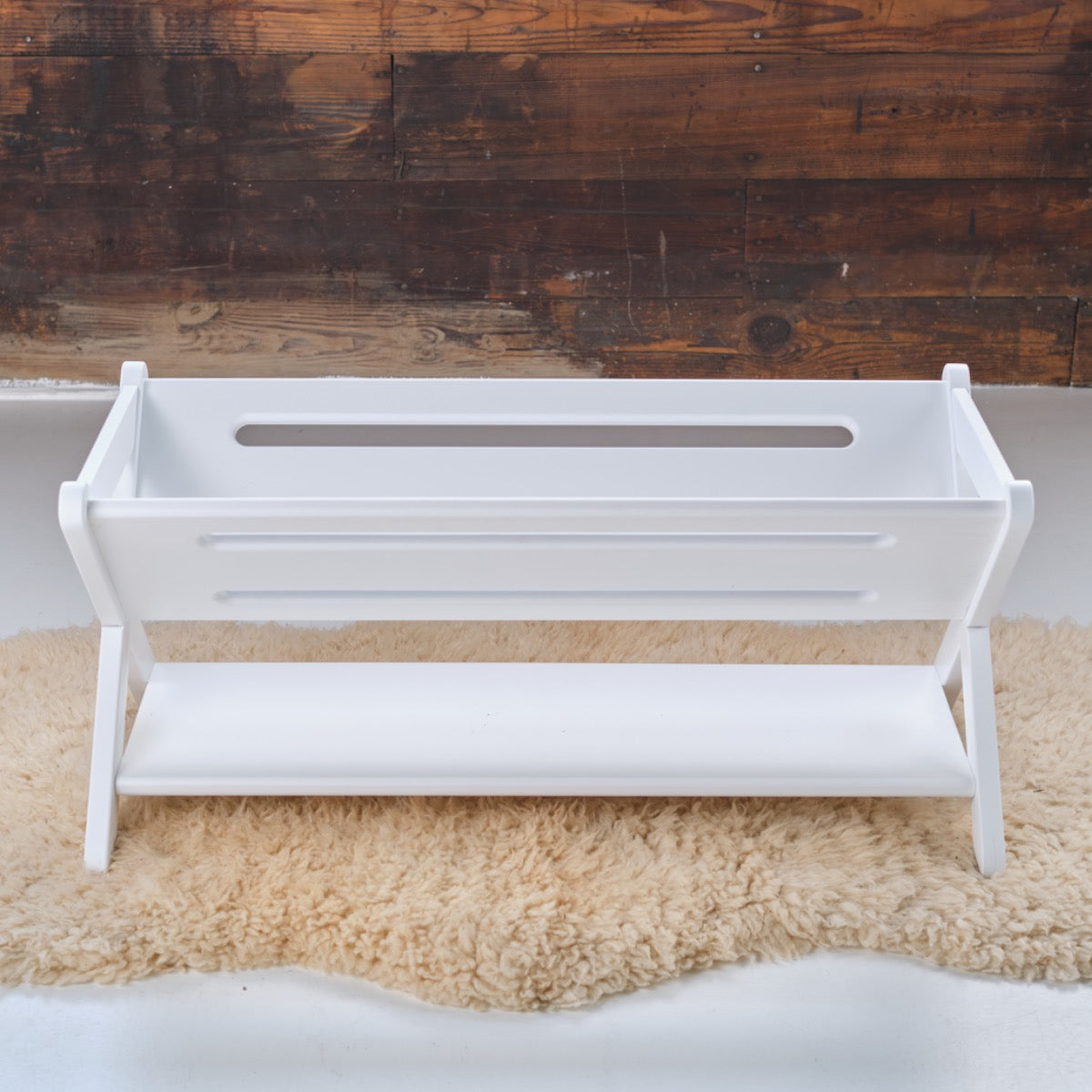 Our popular trough-style bookcase painted in chip-resistant, commercial grade white paint. Perfect for those rooms with a clean, modern design. As always this piece will keep your child's room clean and tidy, while holding books, toys, games, and more!