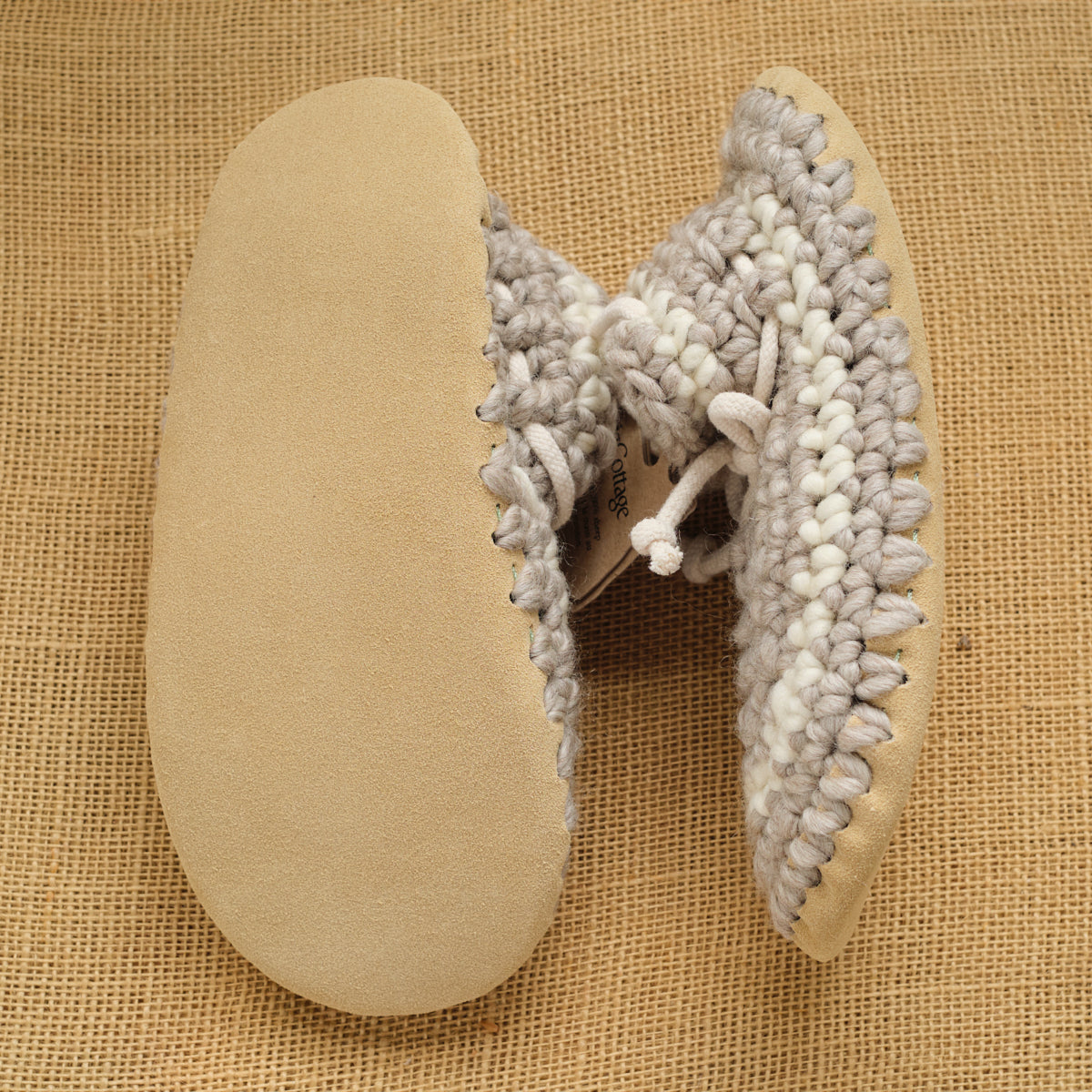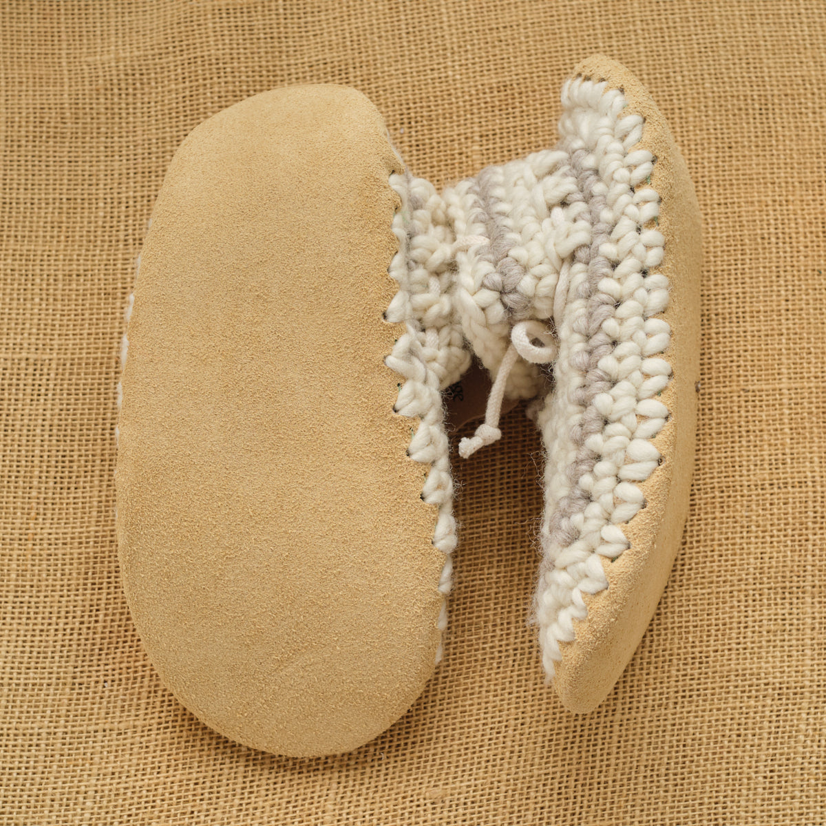 These wool slippers are amazing. Many are used as outdoor shoes in nicer conditions. New Zealand Wool roving crocheted with wool fleece lining and leather soles. They shape and conform to the foot and stretch just a little with use so having a snug fit is desirable. Made in Canada.