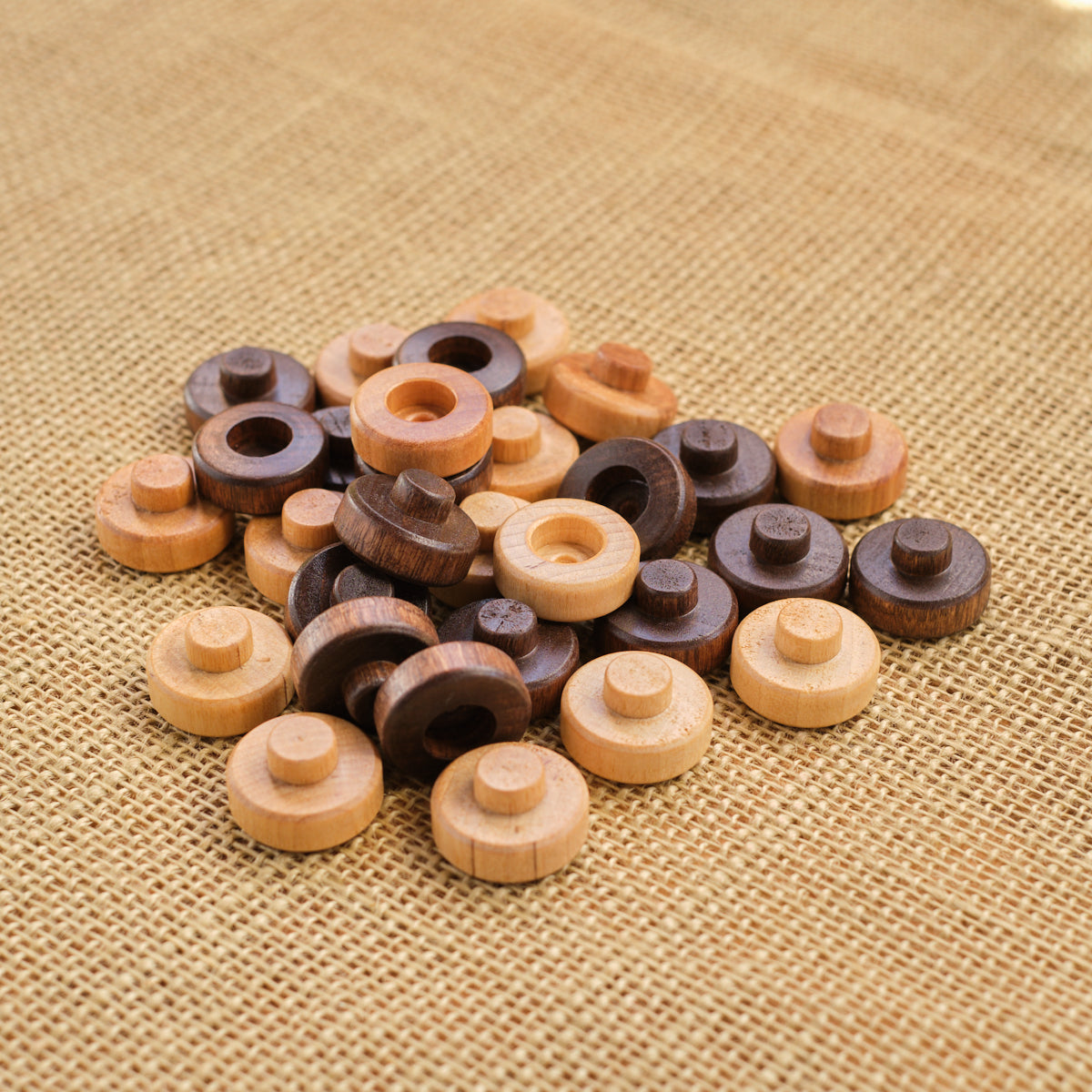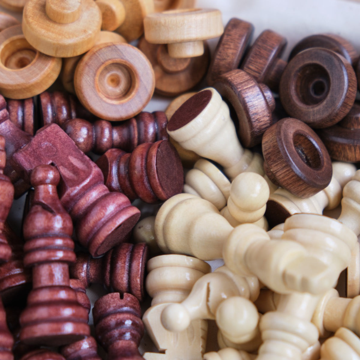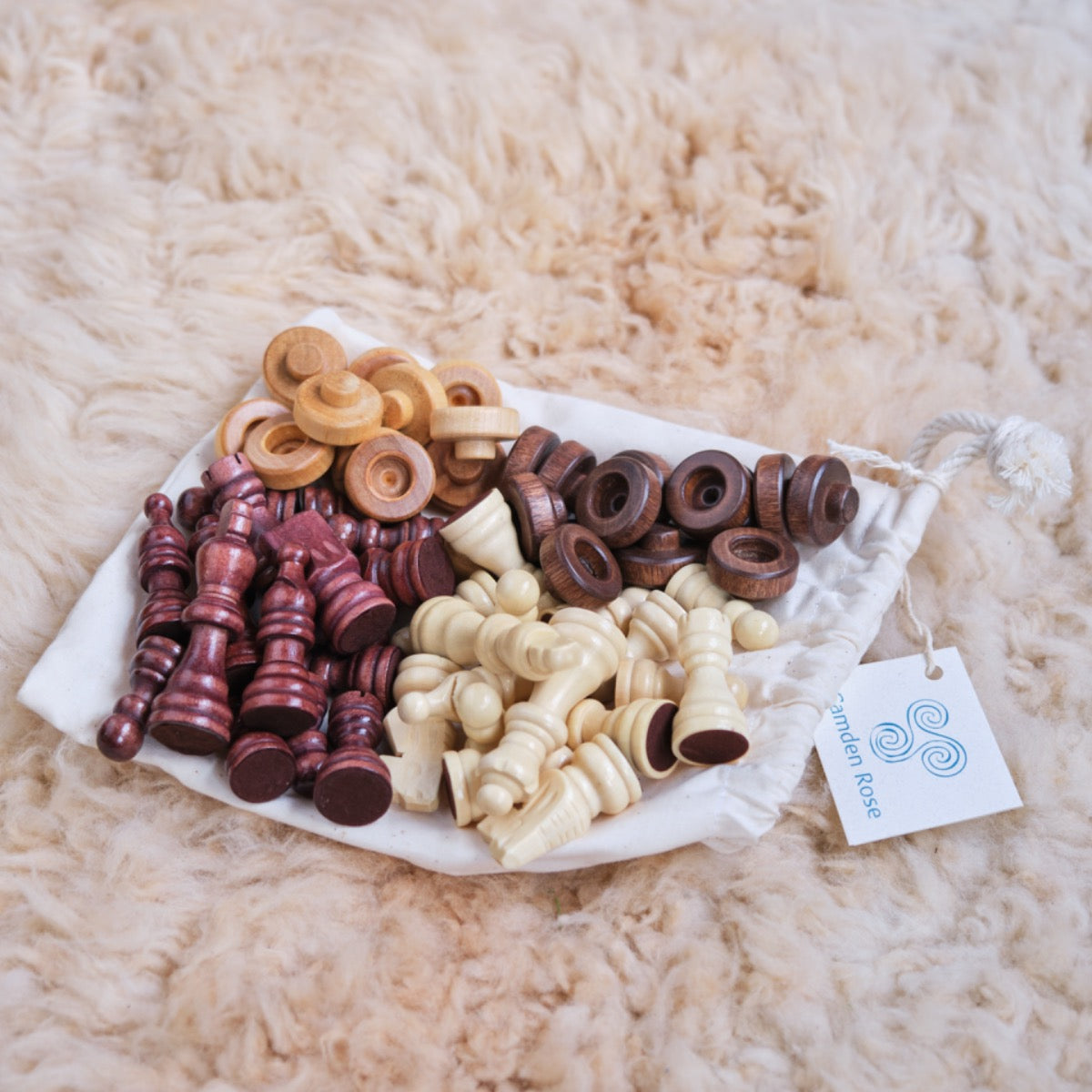 A simple muslin bag keeps your wooden chess and checker (15 of each color so you have a few extra) game pieces stored safely together.