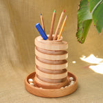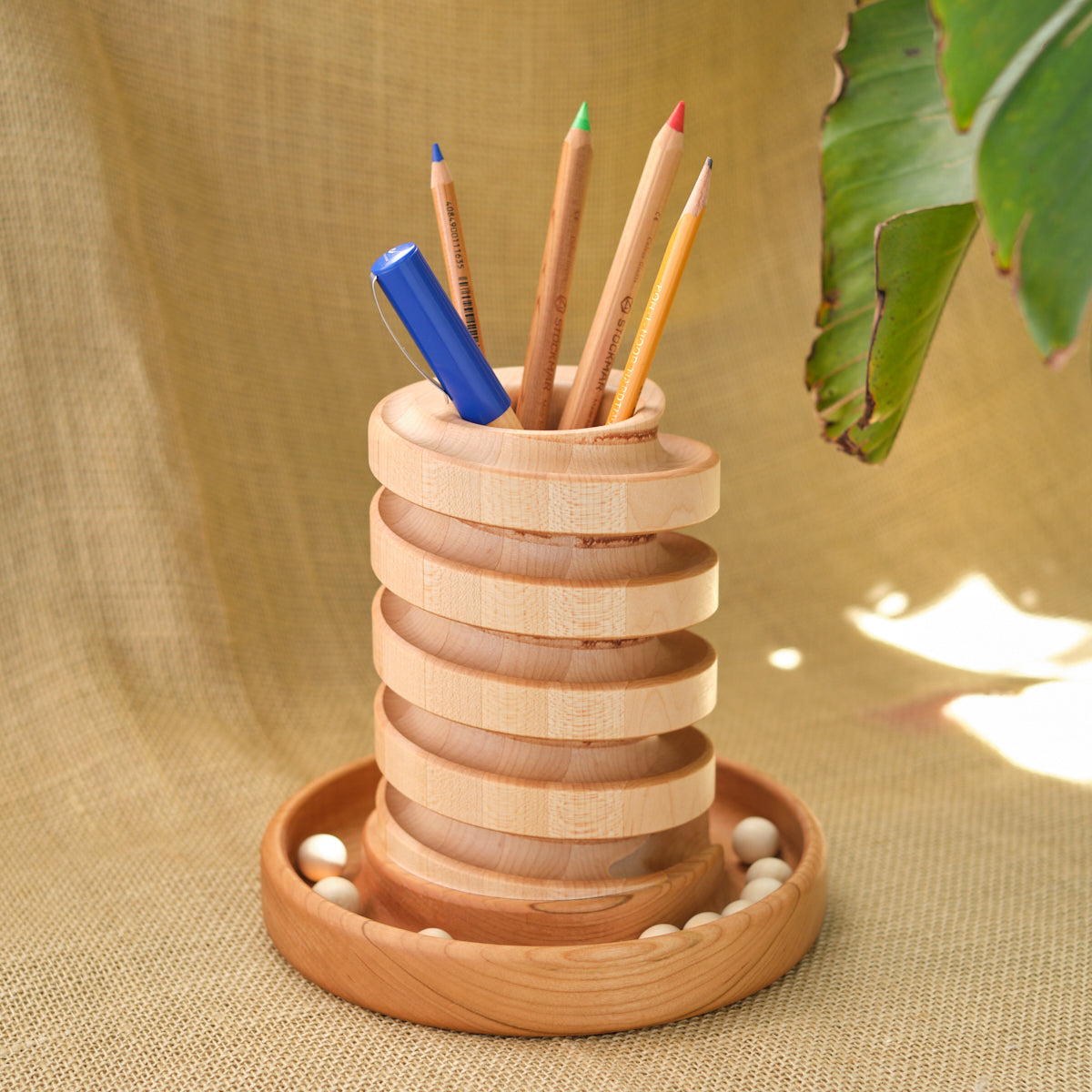 Four grooved concentric hardwood circles on a wooden base hold your pens, pencils and anything else in style. Includes ten (10) 5/8" diameter wooden marbles. This hardwood Desktop Marble Run Pencil Holder is not meant as a toy. May be used with glass marbles also. Finished with Three BEEautiful Bees All Natural Wood Polish.
