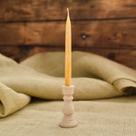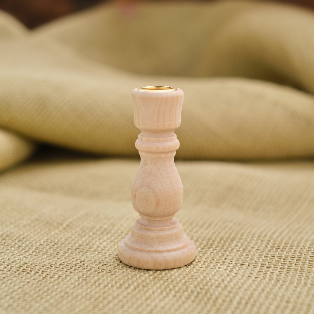 Fitted with a brass candle insert, the turned Wooden Candle Stick is 3" tall, simple yet elegant. Perfect for just a little light! Holds our Hand-dipped 1/2" Beeswax Tapers (sold separately).