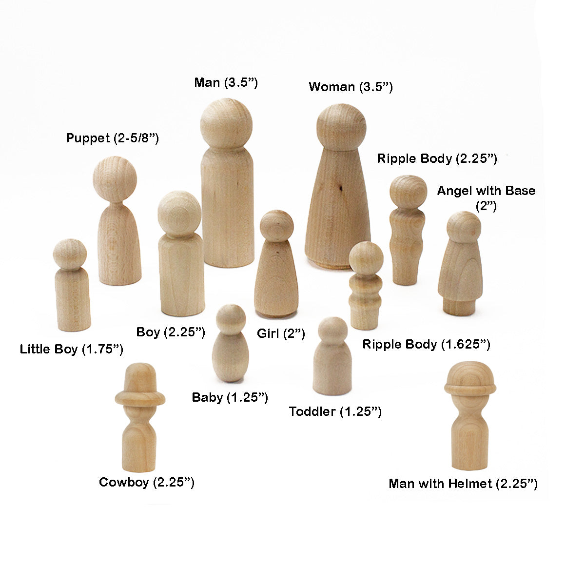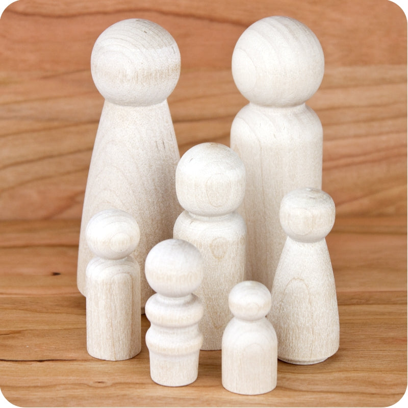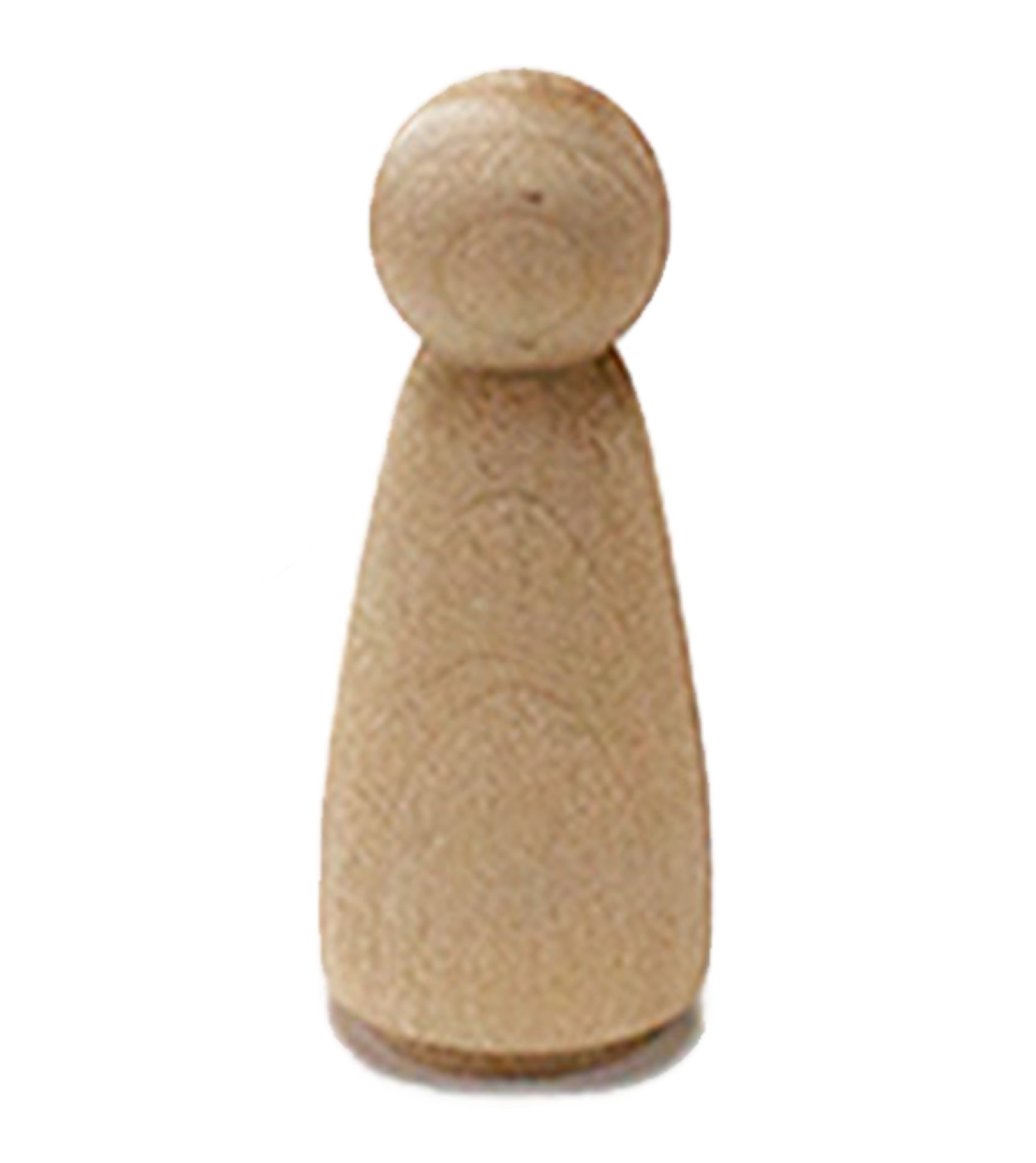 Simple and fun, wooden peg dolls stimulate creative play. Leave the wood natural, rub on some beeswax polish, or get creative with fabric scraps and markers. These peg people may need some light sanding for rough edges. Made in the USA. Peg people are small parts and may be unsuitable for children under 3 years old.