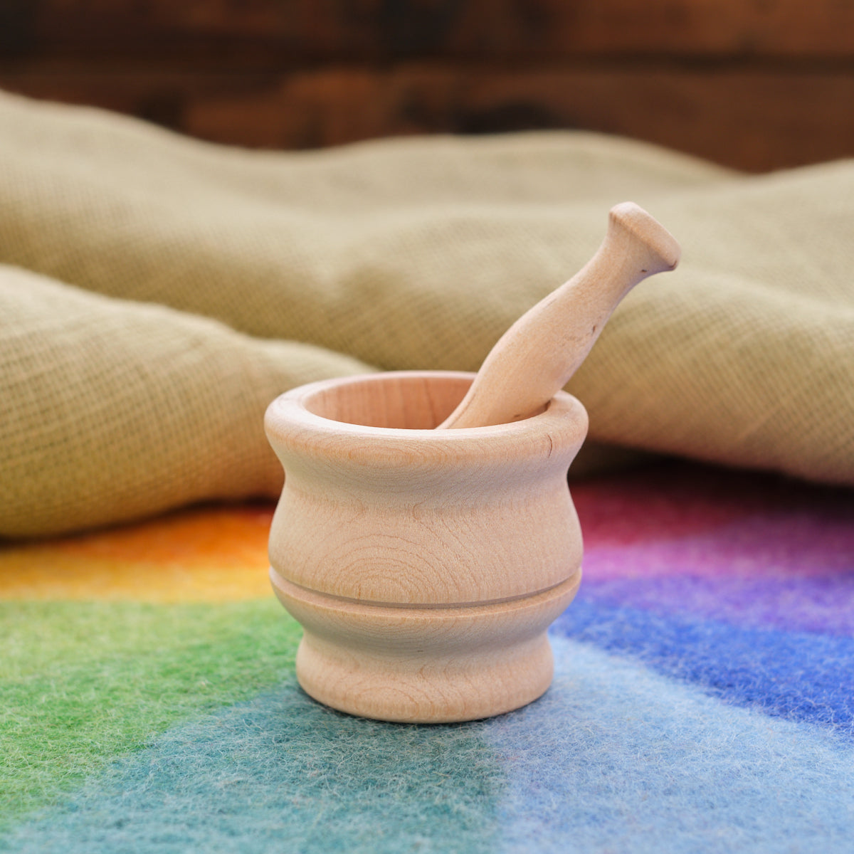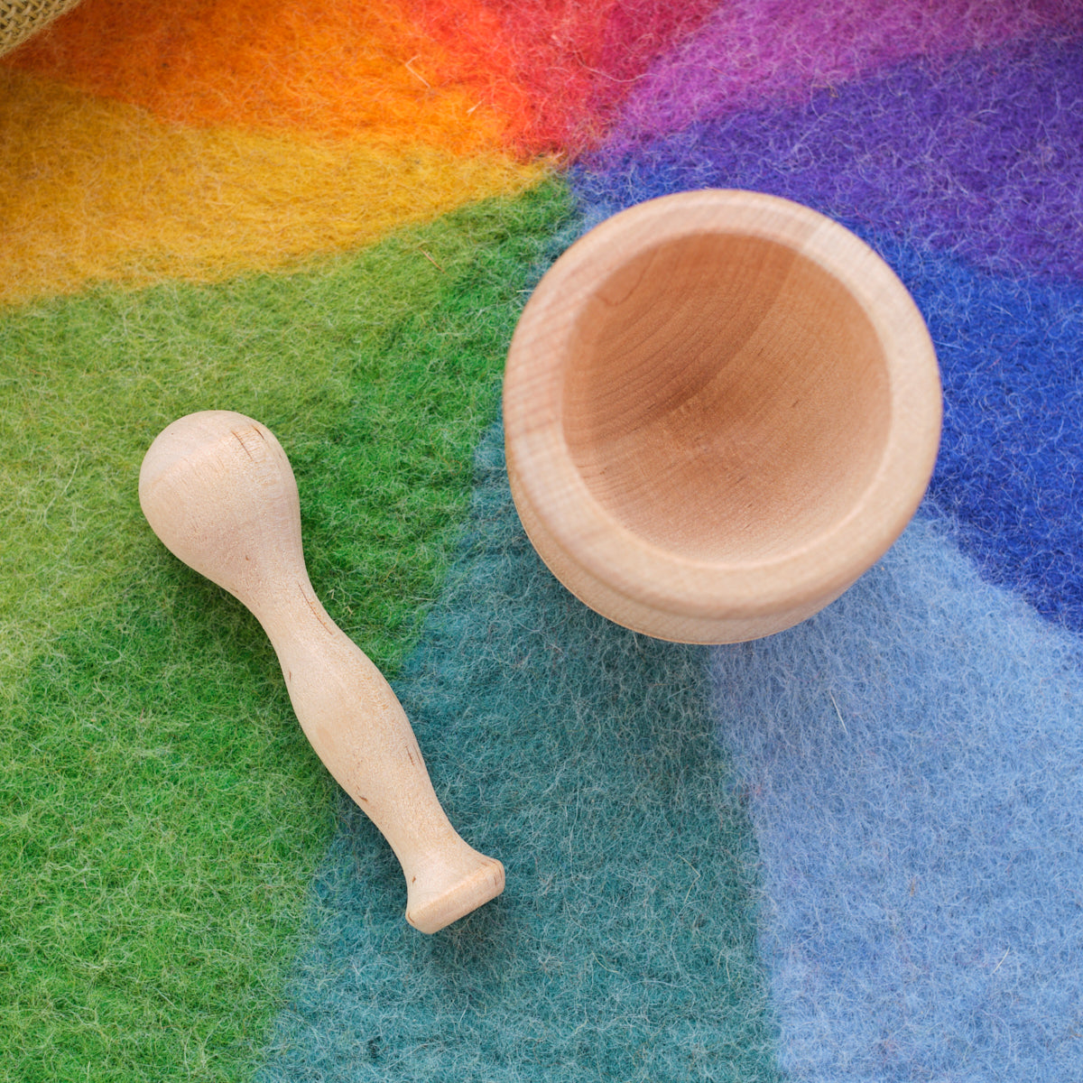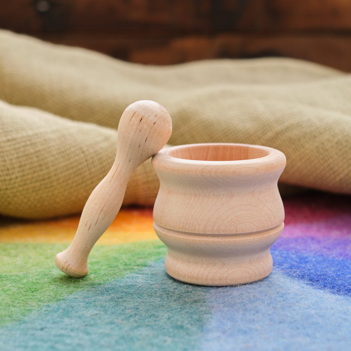 A Wooden Mortar & Pestle great addition to the play kitchen. It is fun to grind and crush stuff up.